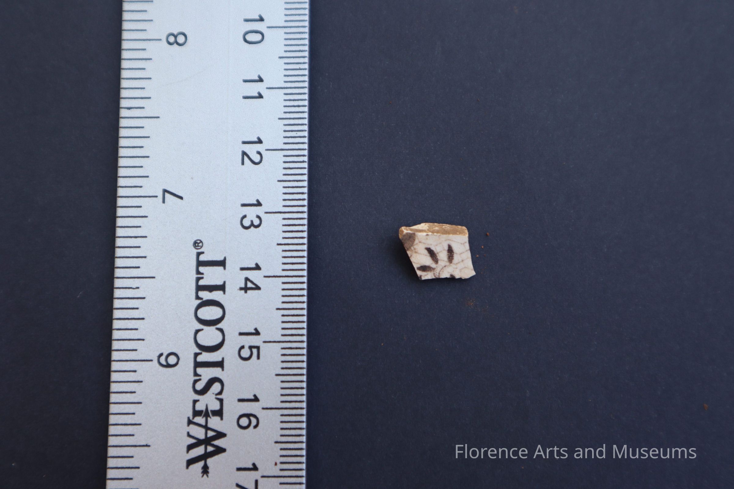 Black transfer printed leaf design on creamware ceramic sherd.Context