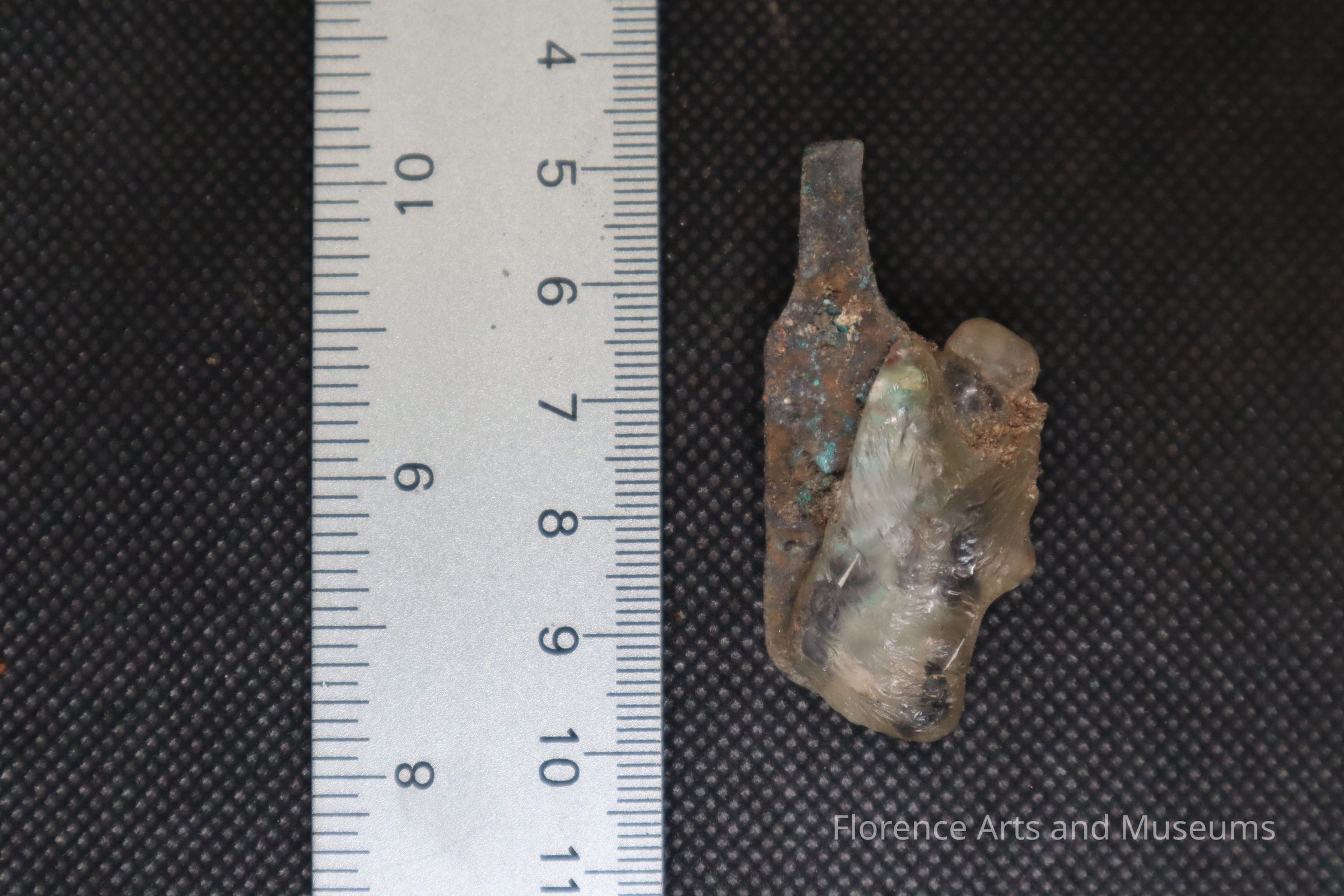 Melted glass with a metal strip on it.