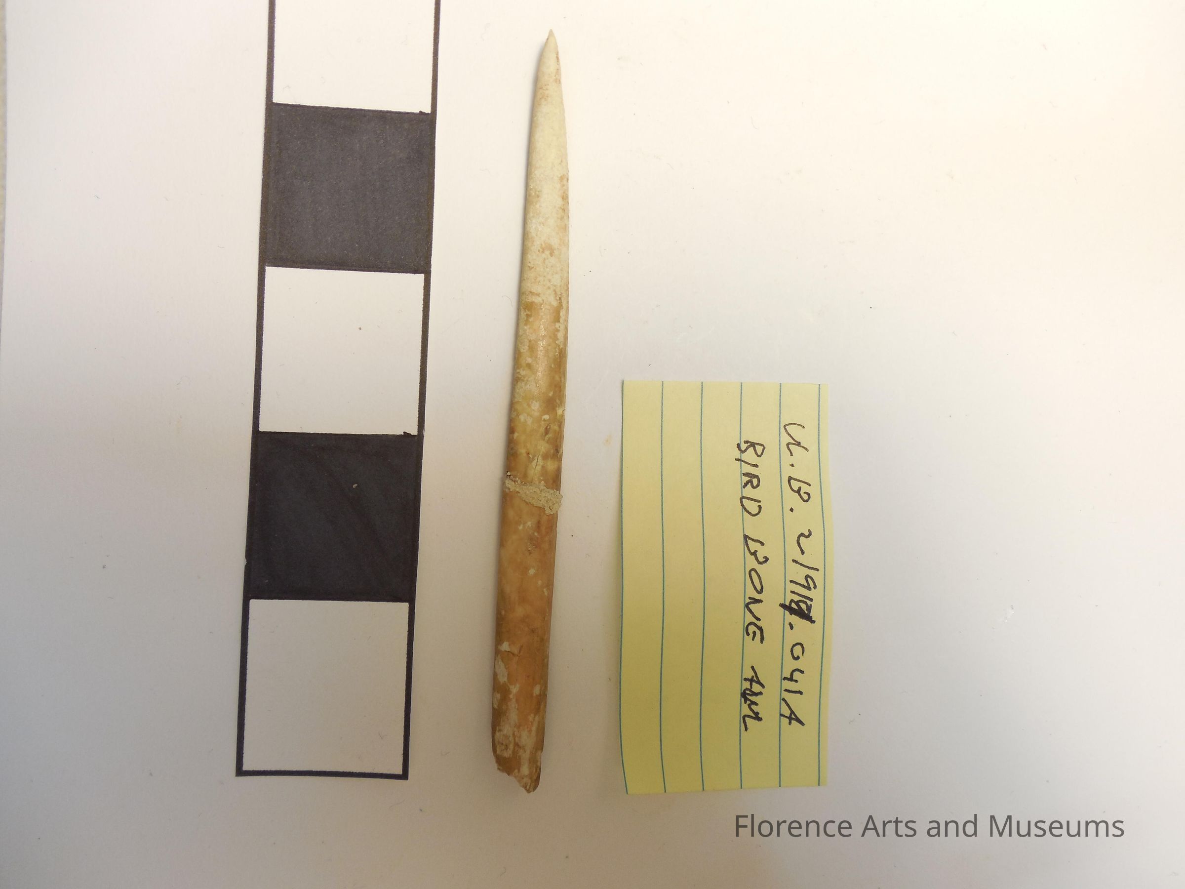 Made from the small bone of a bird, this cylindrical awls were sharpened to a point at one end while the other end is typically a bone joint.Dimensions