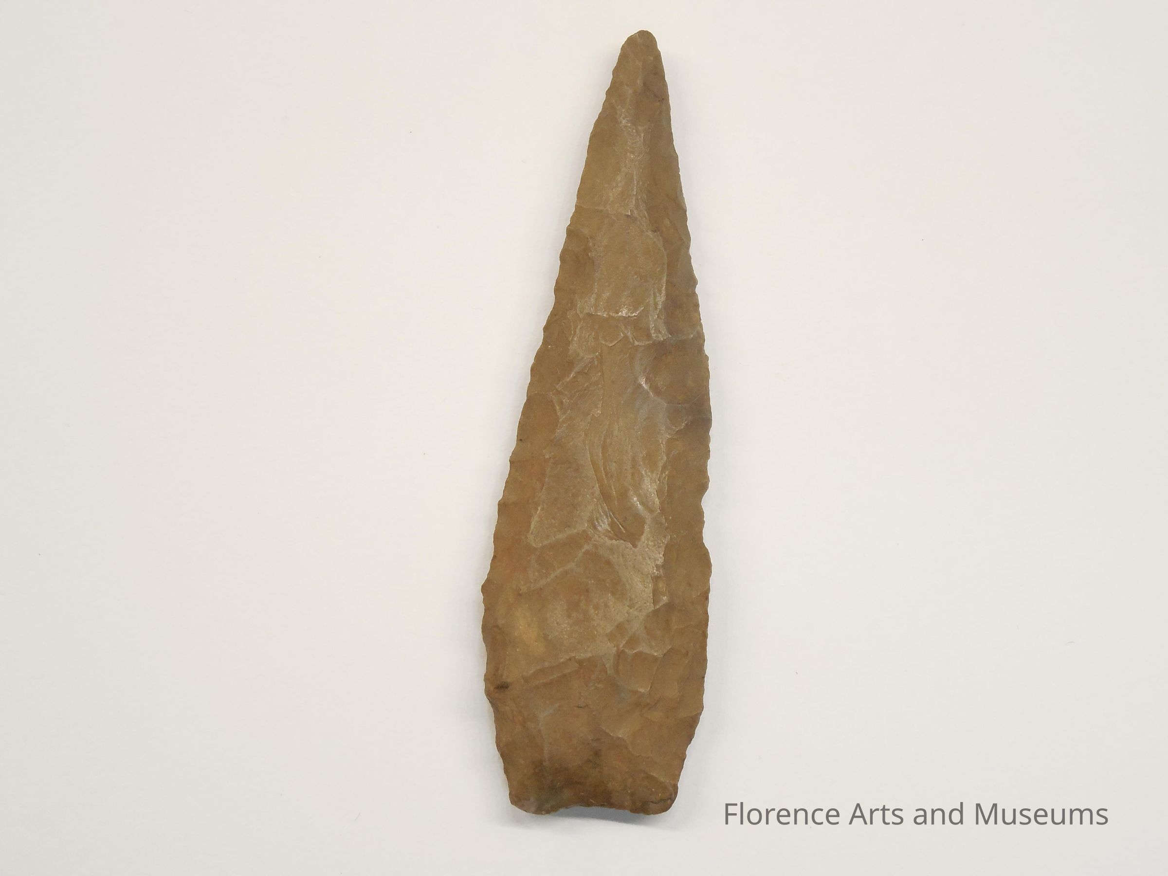The Angostura point is a medium to large lanceolate point. The point was made using long pressure flaking method that created an oblique (diagonal) flaking pattern.