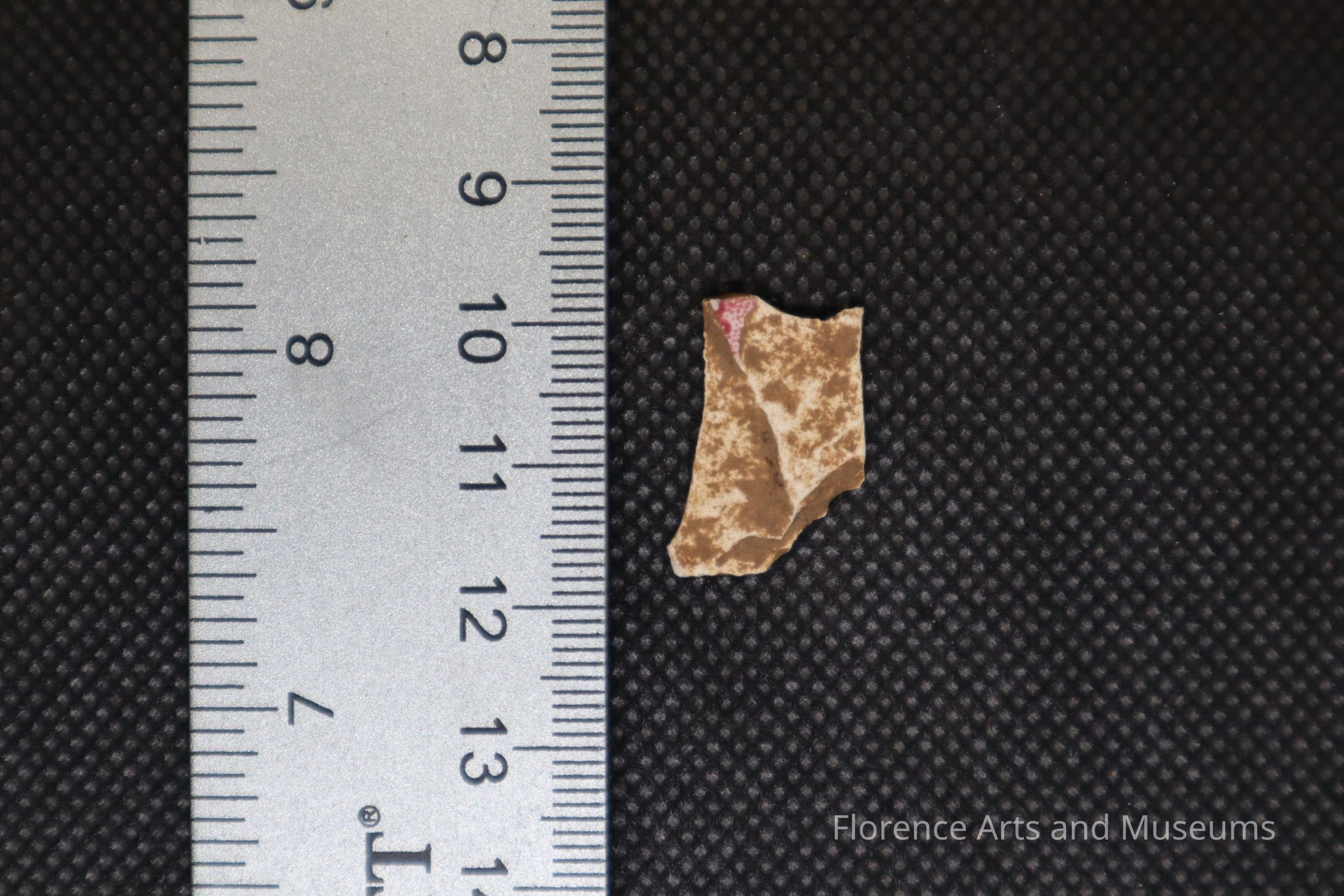 Whiteware fragment, with a small pink transferware on it.Context