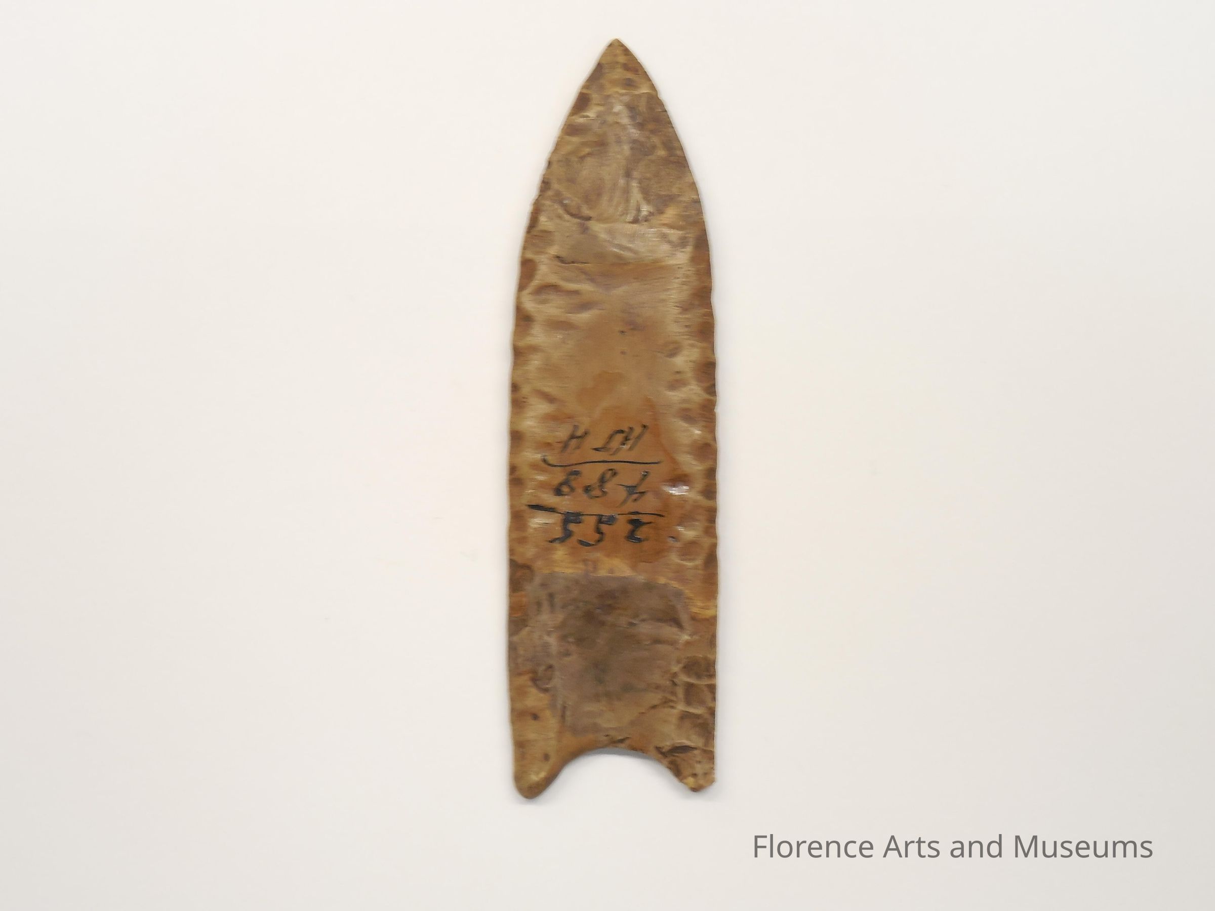The Cumberland point type is a medium to large lanceolate point. The base in recurvate with a tapered hafting area. The base is expanding and concave. Most examples are fluted and made with collateral (parallel) flaking. The point is named for the Cumberland River basin where many points were found. It is thought to be a spear or atlatl point. This point is partially reconstructed.Context