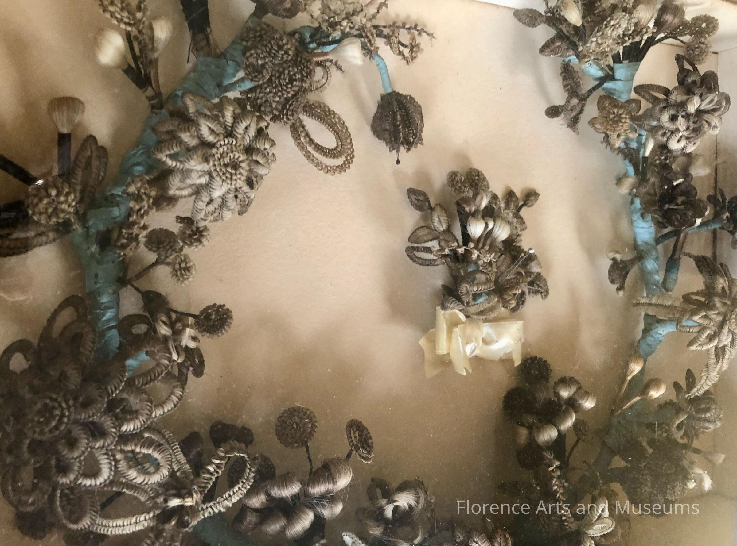 Decorative wreath made of hair, wire, and ribbonsContext