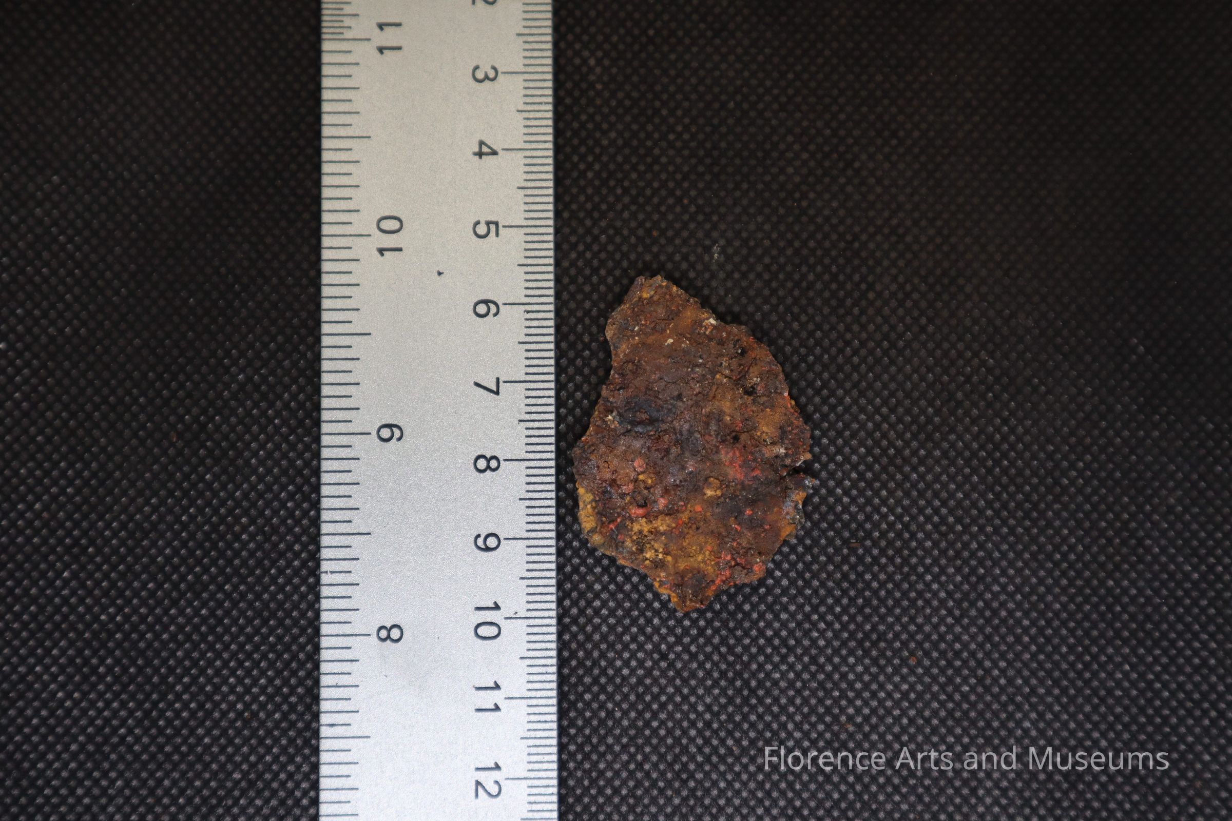 This metal flake fragment was excavated from the cistern on February 25th, 2024, at Pope's Tavern.
