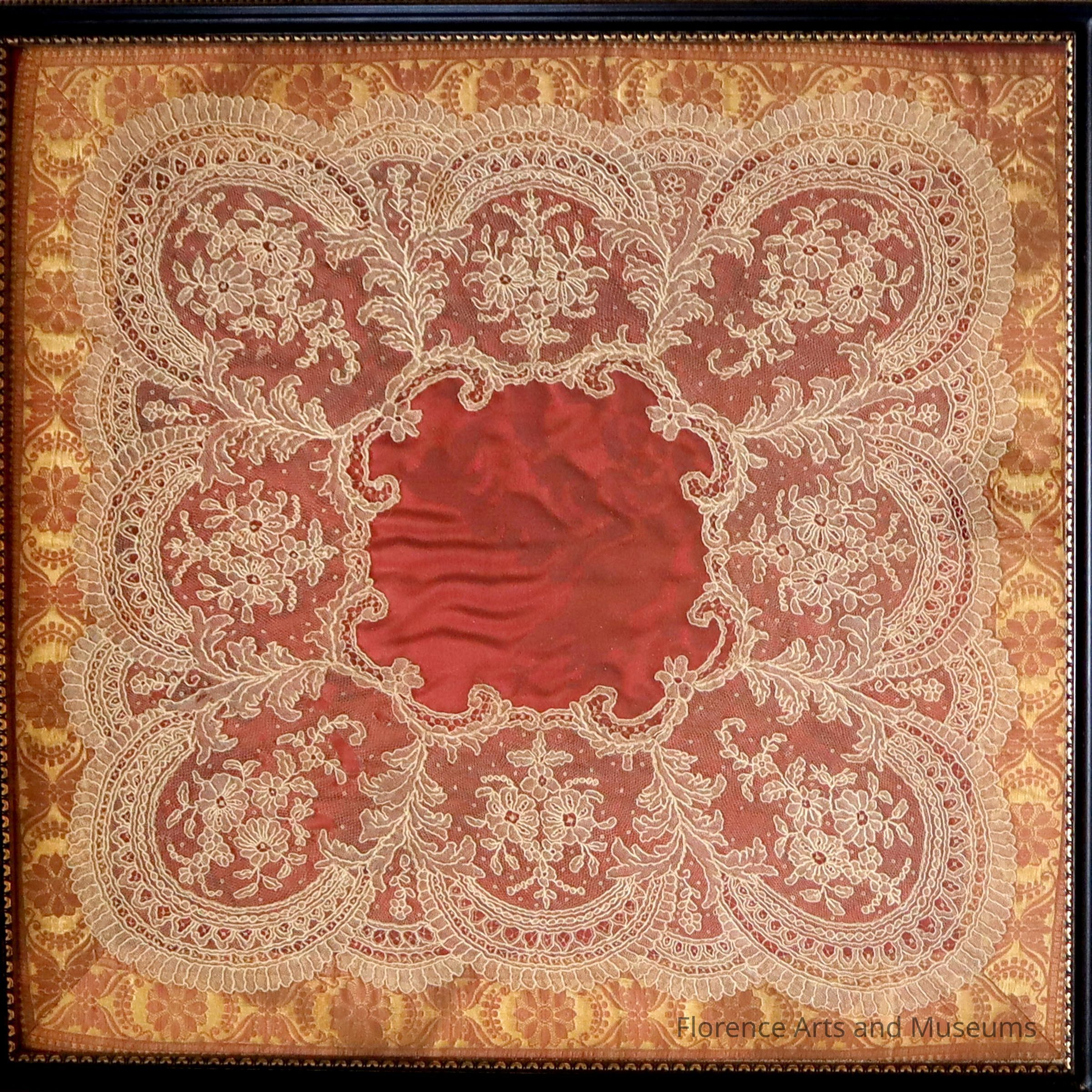 Wedding handkerchief of Elizabeth Woods (1838-1865), who married Samuel Kirkman on June 3rd, 1858 in Nashville, TN. Behind the handkerchief is a piece of curtain made in about 1845. Samuel Kirkman (1832-1903) graduated from Harvard University in 1850 and was engaged in cotton manufacturing in Tuscaloosa during the Civil War. He later worked as a cotton crop statistician. Susan Kirkman Vaughn was their daughter and the first curator of the collection now at Pope's Tavern.