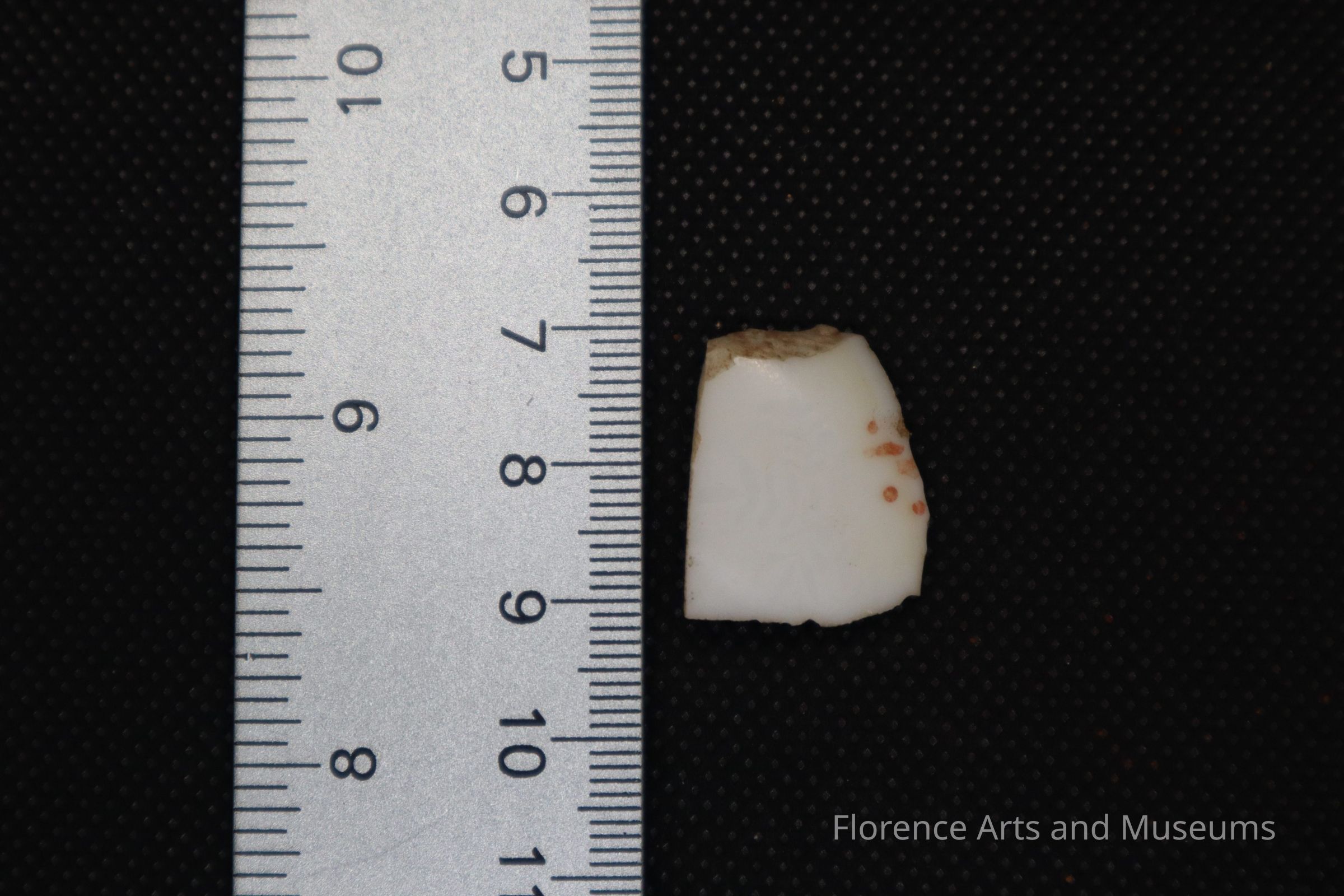 A sherd of whiteware with orange dots- possibly a sprig design.