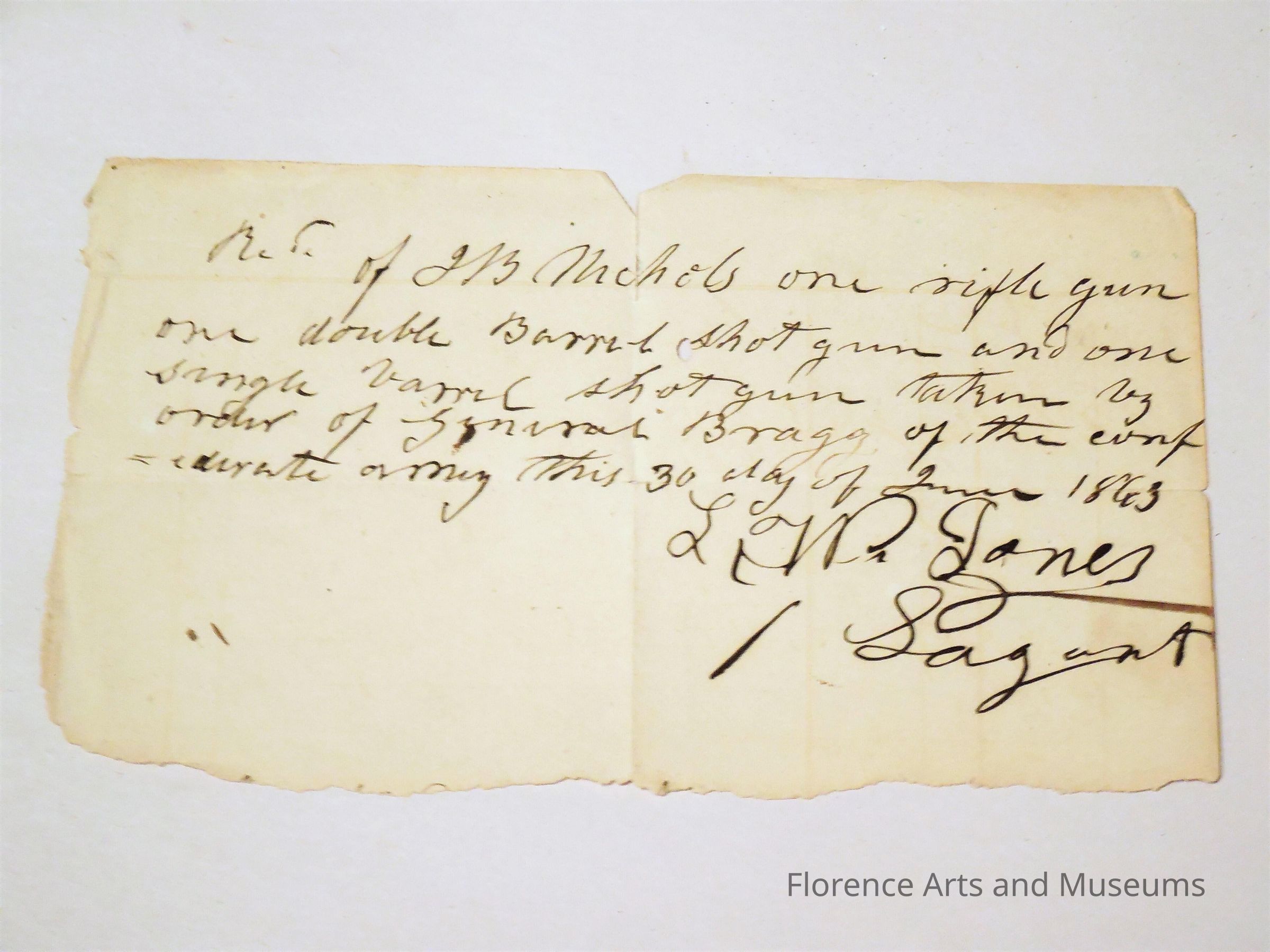 Weapons receipt for one rifle, one double barrel shotgun and sone single barrel shotgun take by order of General Bragg on June 30, 1863, ordered by "L.W. Jones"Context