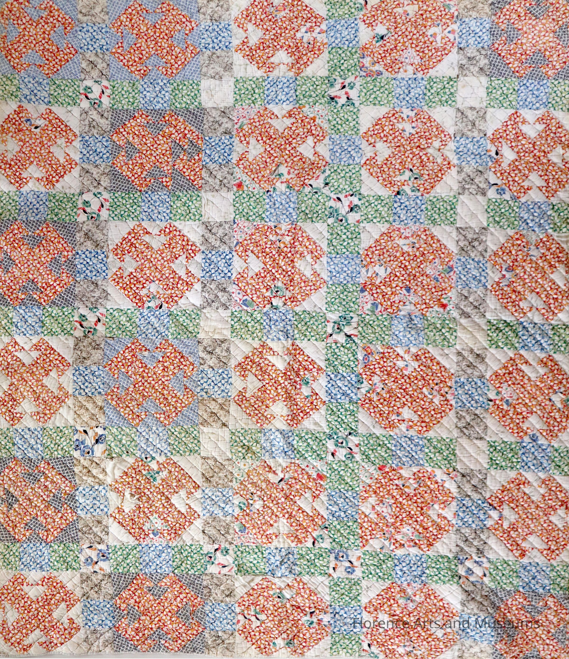 Quilt of orange, green and blue. Made of a "Double T" pattern. Size 78"x64"Context