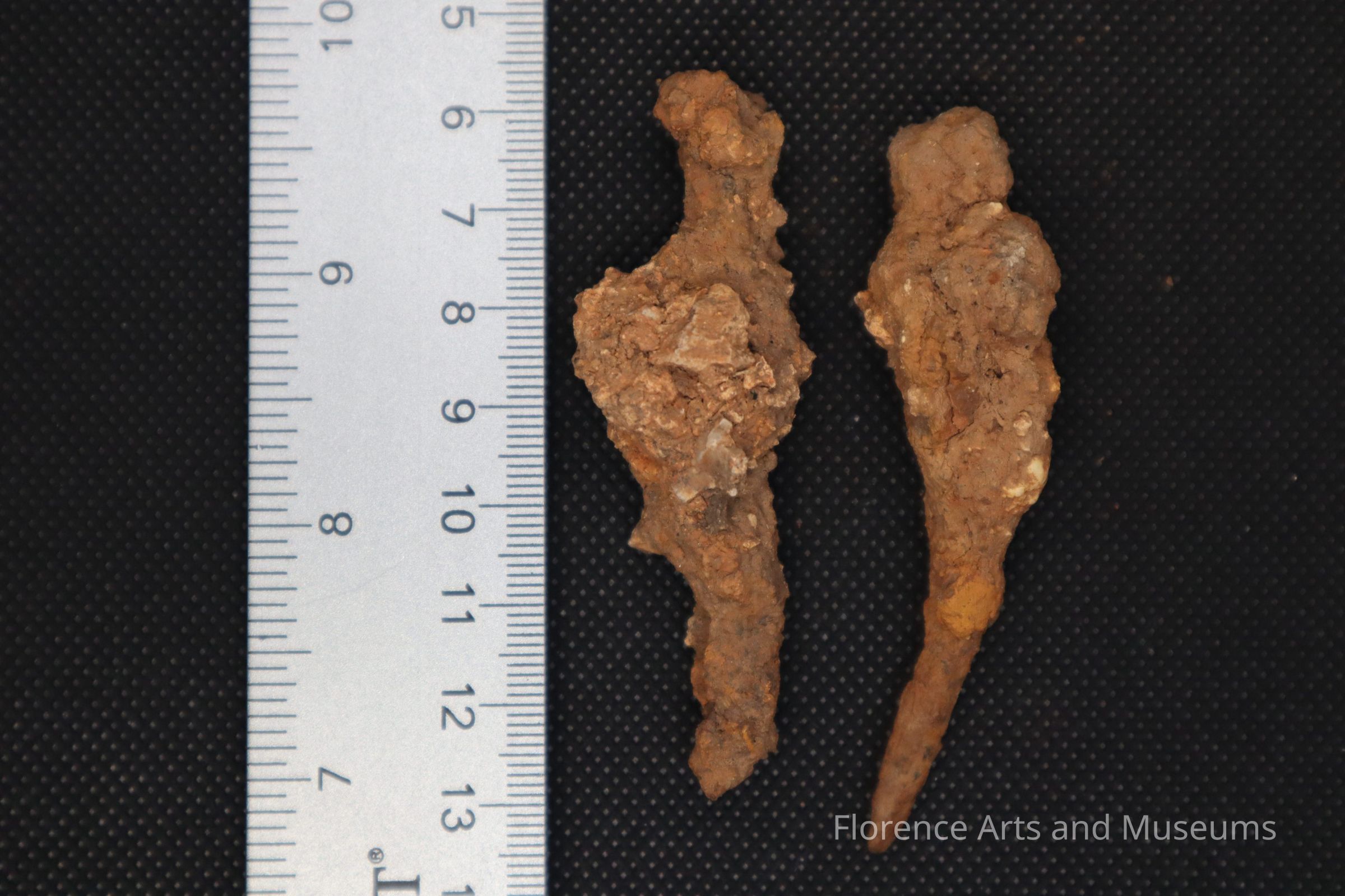 These spike fragments were excavated at the cistern on the dirt sifting level on December 10th, 2023, at Pope's Tavern.