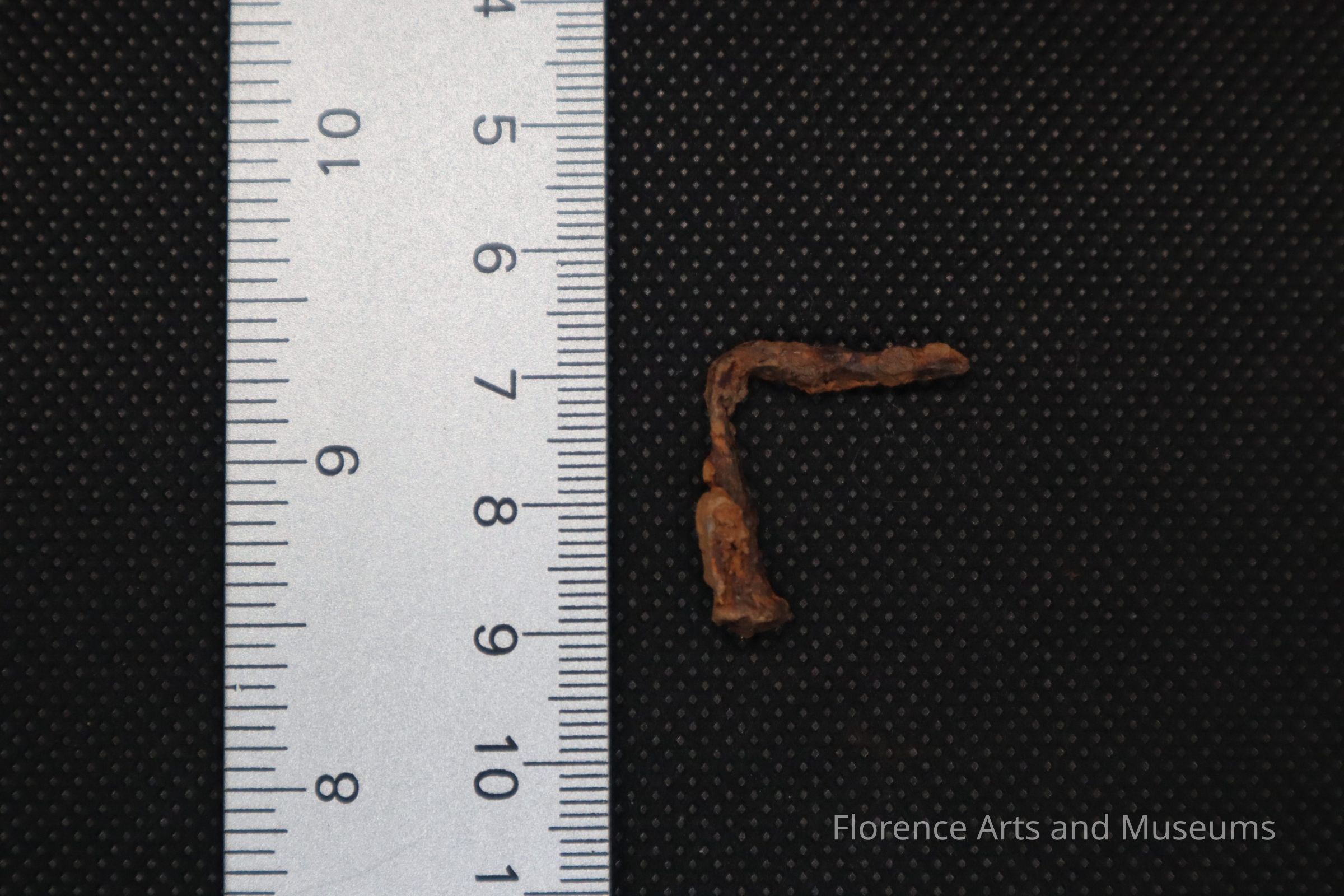 This nail was excavated at Test Unit 3, Level 2 on April 16th, 2023, at Pope's Tavern.