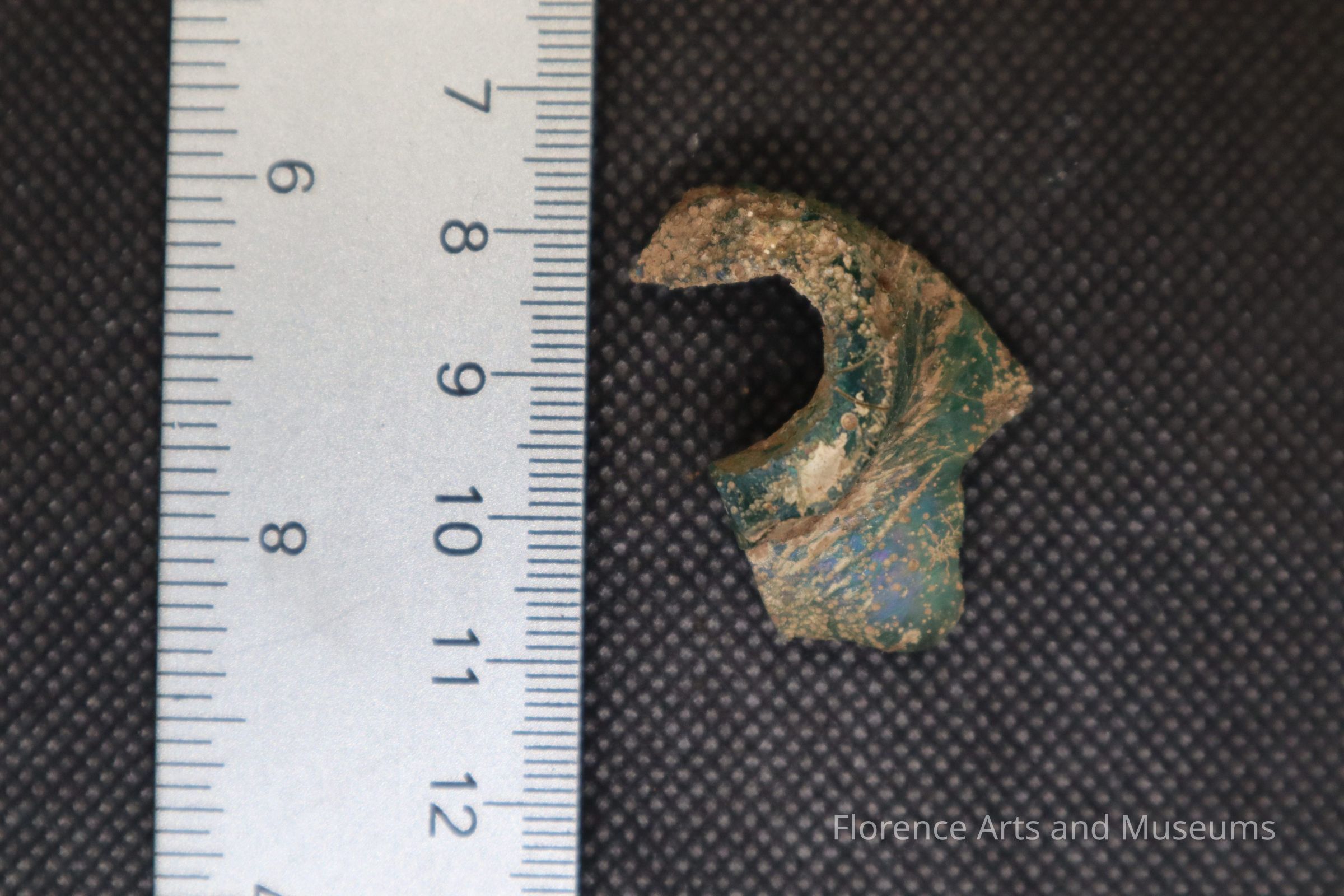 Burnt aqua bottle lip container glass fragment.Entry/Object ID