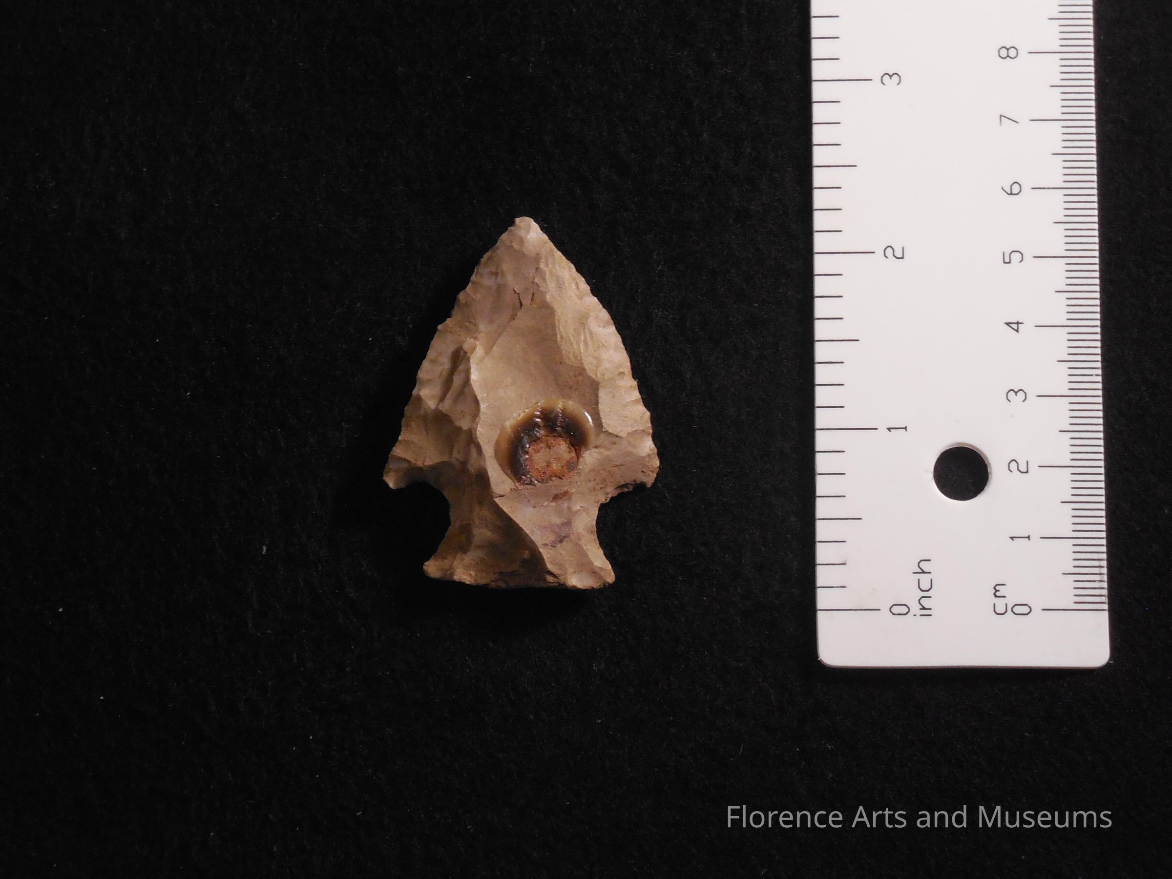 The McIntire point is triangular in shape with an expanding stem and a typically straight base. The shoulders may angle upward or be slightly barbed. Often, it has a asymmetrical shape. This point is named for McIntire Ditch in Limestone County, AL.Context