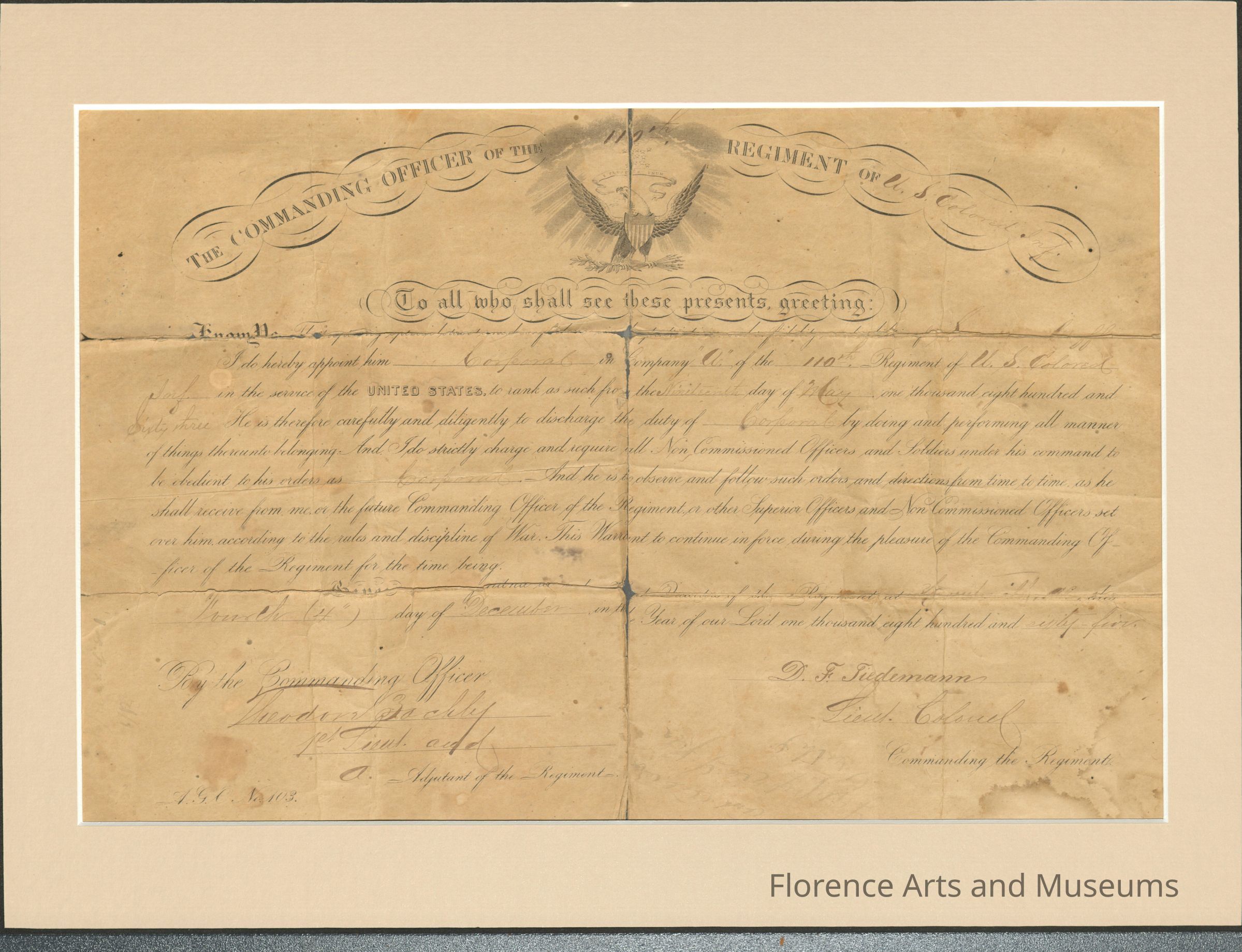 Enslaved in Florence, Coffee escaped slavery to fight for the 110th Regiment United States Colored Troops during the Civil War. These documents chronicle Coffee’s promotion to colonel of Company A of the 110th. The 110th was stationed in north Alabama and Tennessee, guarding railroad lines for the U.S. Army and discharged from the army at Huntsville in 1866.