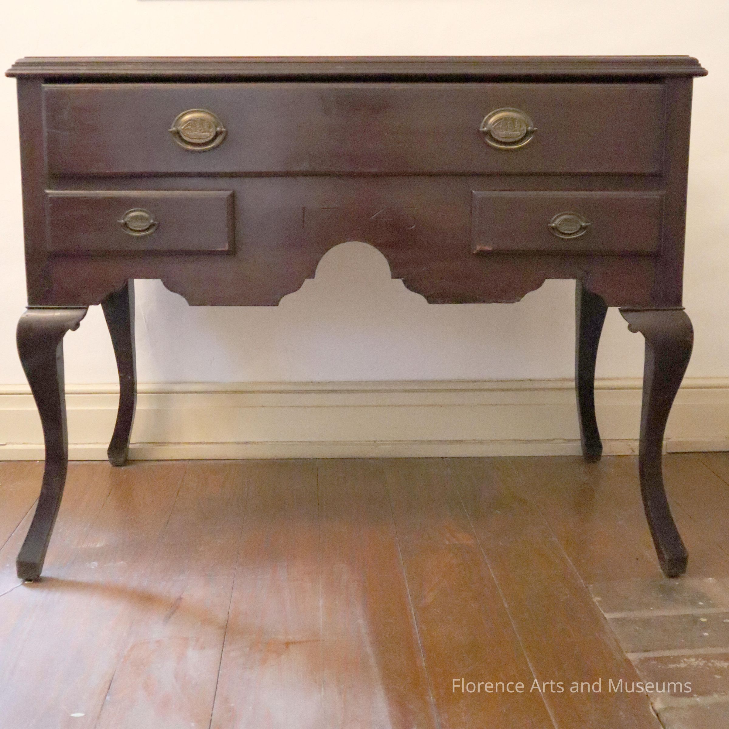 Wooden chest with three drawers and cabriole legs."1743" engraved on the face and the drawer pulls feature the U.S.S. Constitution. The top is composed of two pieces.