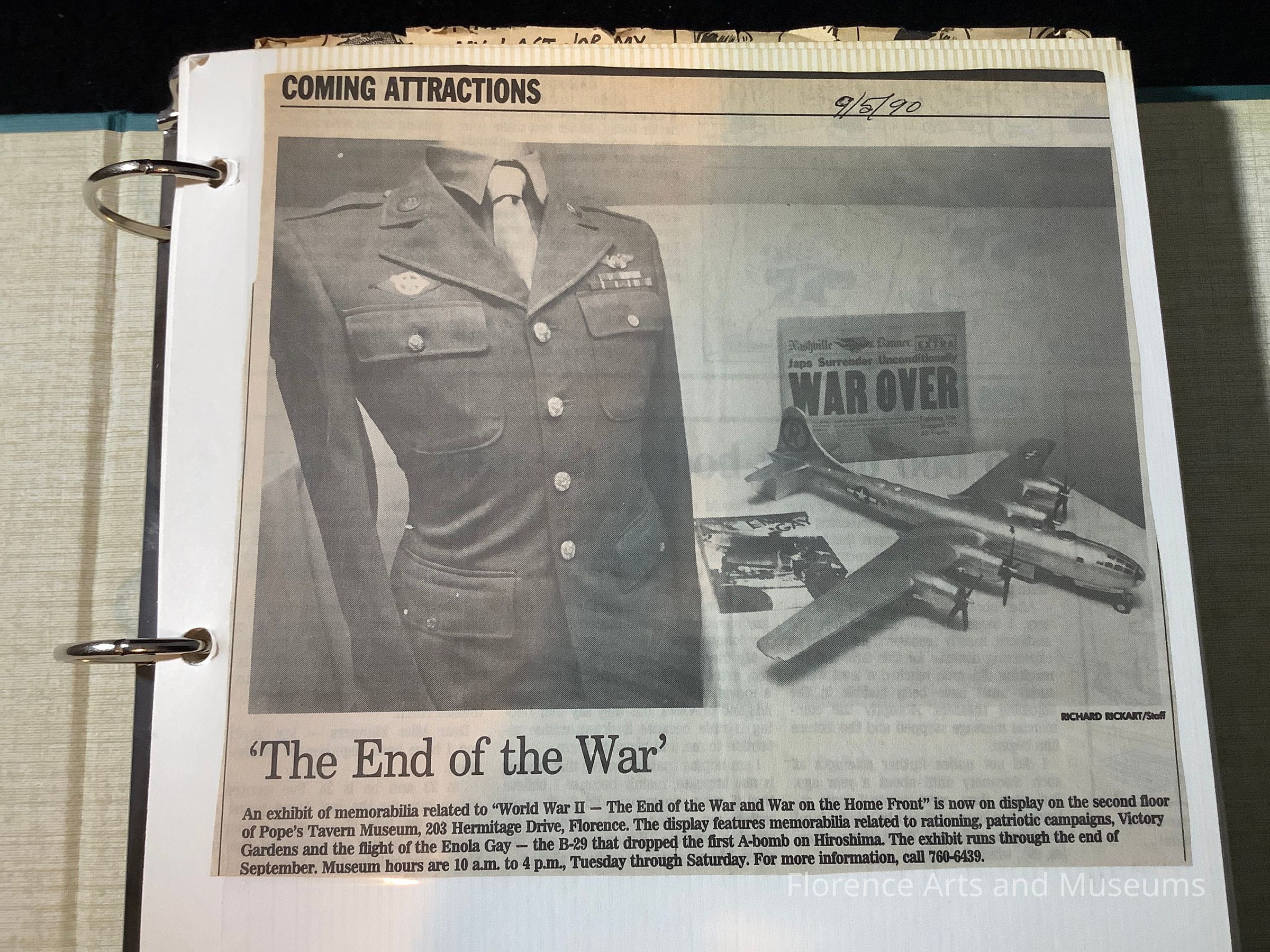 These newspaper articles are from around Florence, detailing events such as Bird’s Day, Annual tree lighting ceremonies, and living history camp. This scrapbook also features articles about Pope’s Tavern’s World War II exhibit, which was once featured on the second floor of Pope’s Tavern.