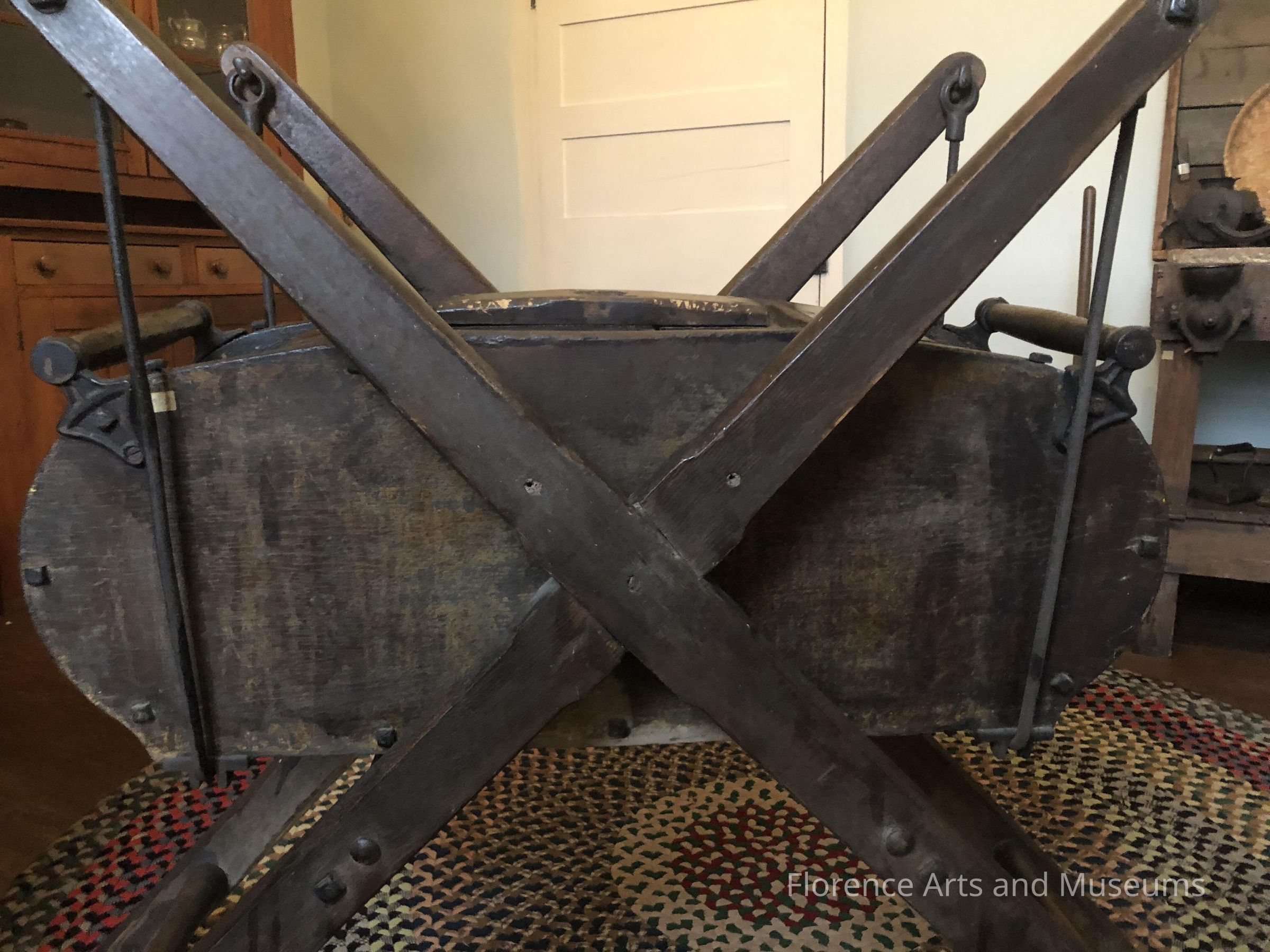 Marketed as a time-saving household implement, the swing churn was often sold with a treadmill for animals and a pulley to connect to the churn. It was often used without the treadmill and was an easier, more efficient way to make butter.Made/Created
