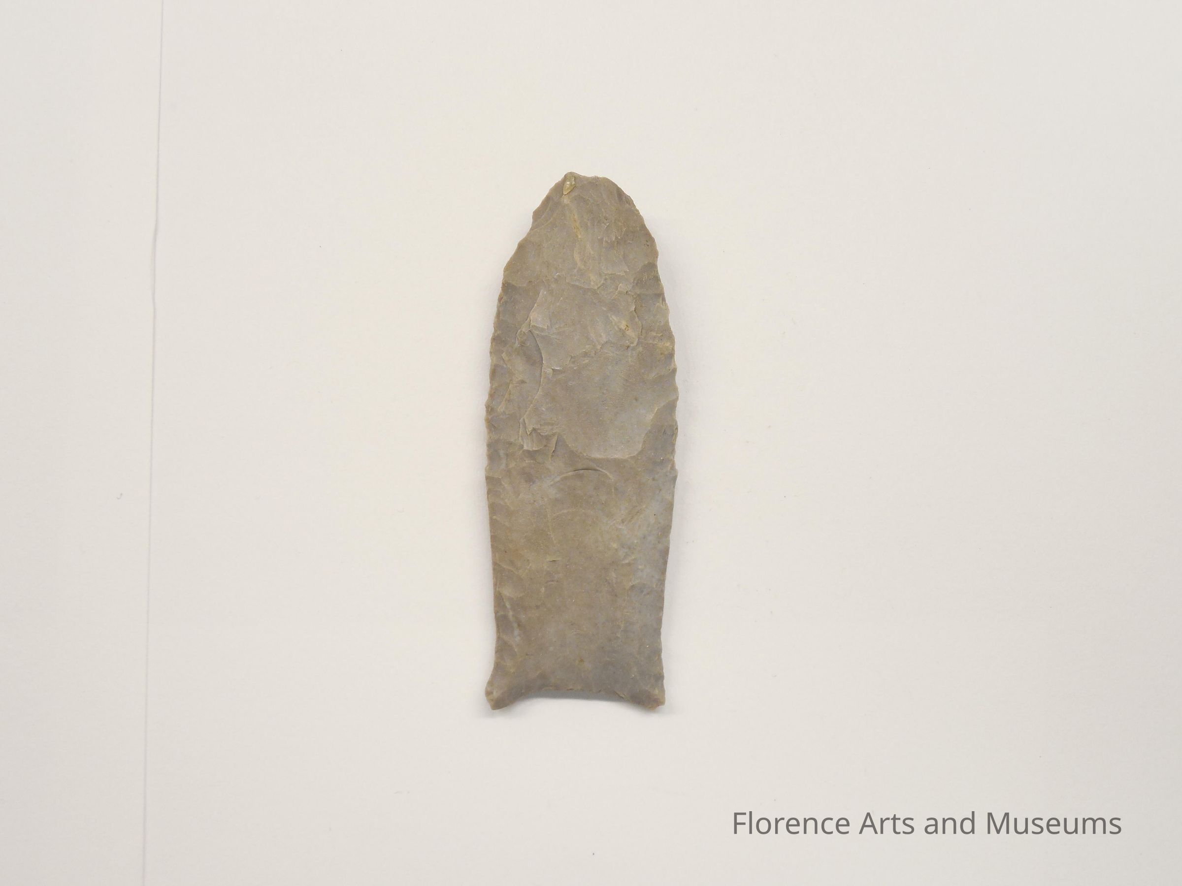 The Clovis point type is typically triangular and fluted with a concave base. The flute typically runs from the base on one or both sides and can cover up to 1/3 of the size of the point. The Clovis is made through percussion flaking with pressure flaking to finish the blade. The Clovis point was first identified near Clovis New Mexico in 1935 and long thought to be the first lithic technology in North America.Context