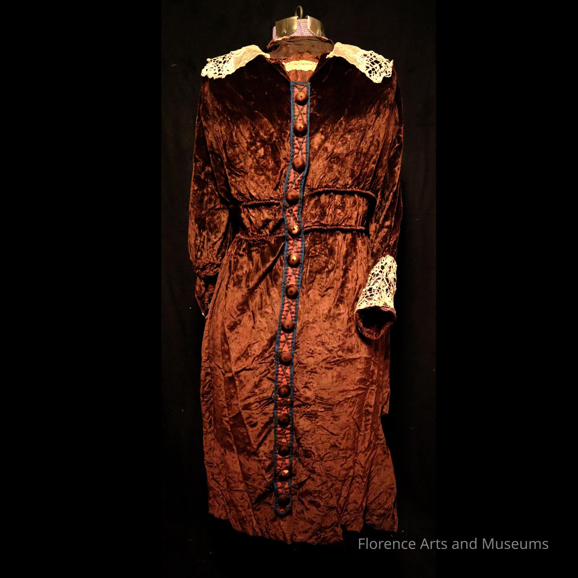 Likely from the early 1920s or 30s, this dress would have been worn to an evening event such as a Christmas party, cocktail party, dinner, etc. The color and fabric of the garment indicate that it would be worn for such occasions. During the early to mid-20th century, velvet and lace were considered a luxurious fabric, therefore more appropriate for evening events as opposed to daytime. The buttons on the garment appear to be made of wood, but bone was also a popular material used to make buttons during this time.