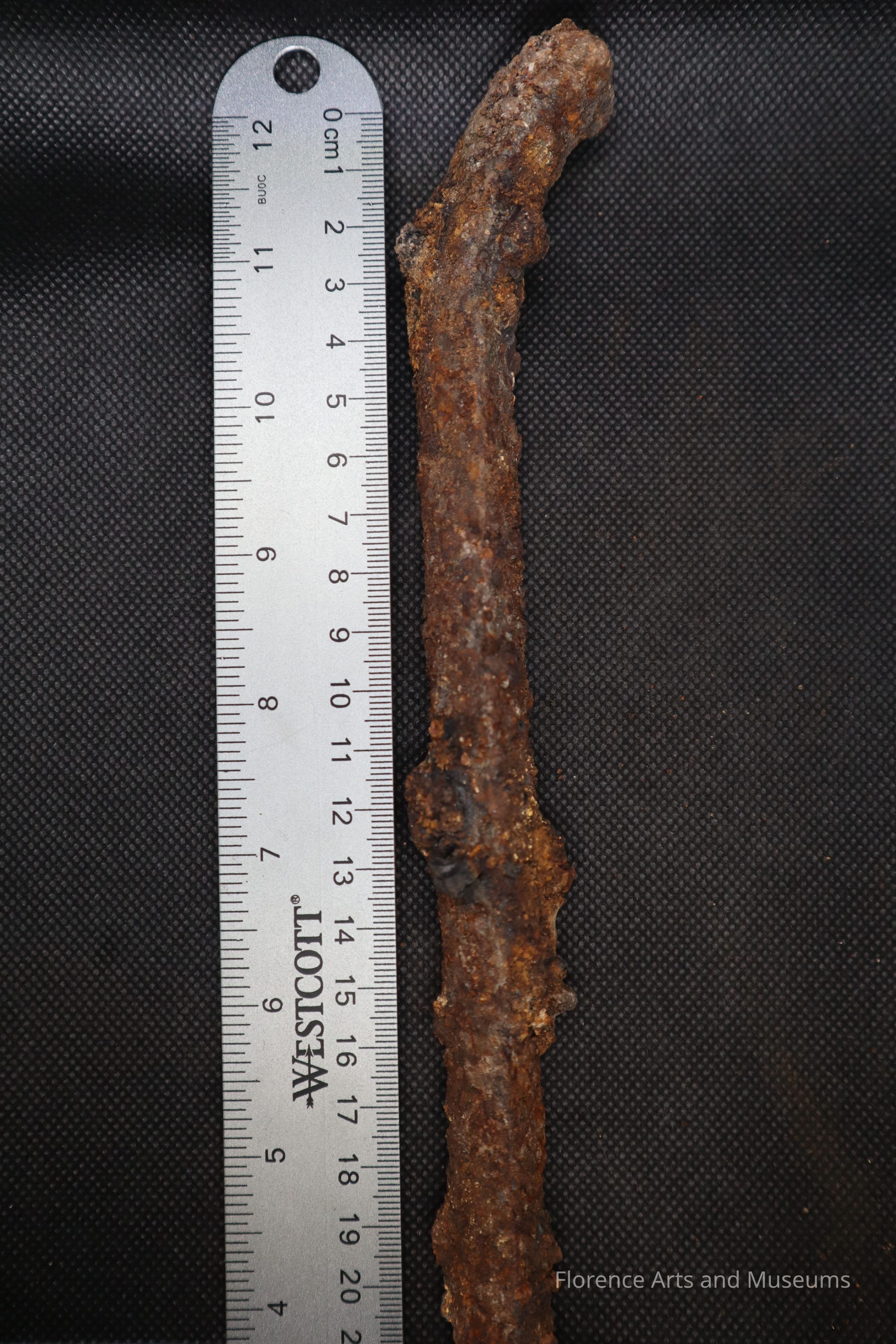 This metal bar was excavated at Quadrant 1 of the cistern on March 10th, 2024, at Pope's Tavern.