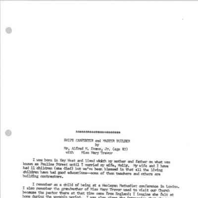 Interview of Alfred M. Evans, Ship's Carpenter and Master Builder, by Mary Trevor, 1976. The 82-year-old Evans recalls the techniques he used in designing and constructing watercraft and buildings in Key West in the first part of the 1900s.Collection