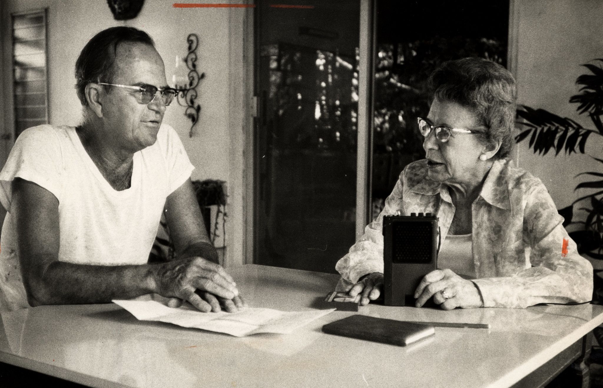 Mary Malone records Henry Higgs for the Woman's Club oral history project from a Miami Herald article of June 19, 1975.Collection