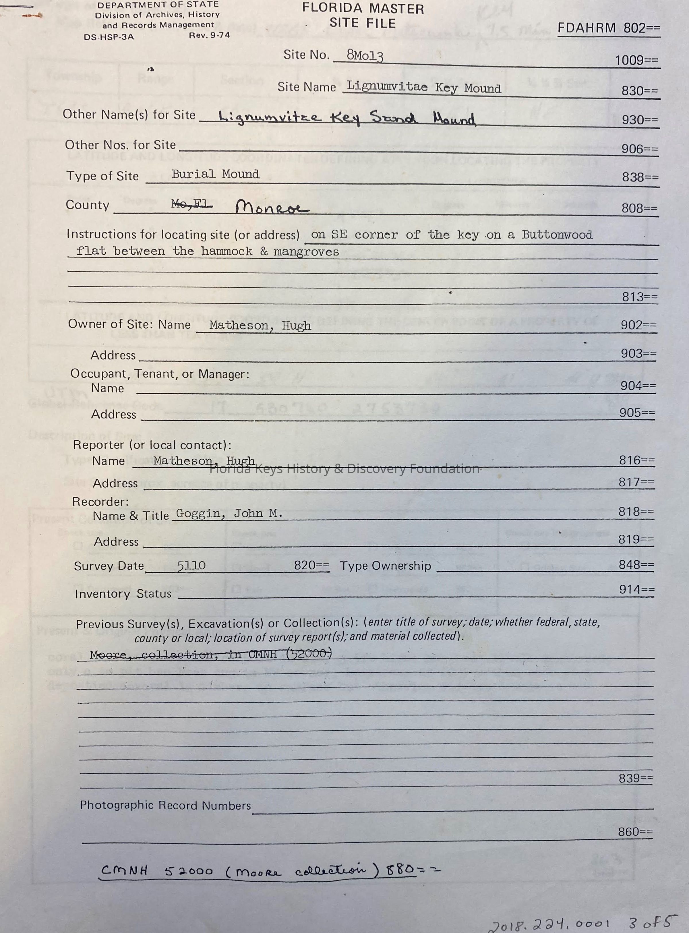 Lignumvitae Key Burial Ground MO-13Entry/Object ID