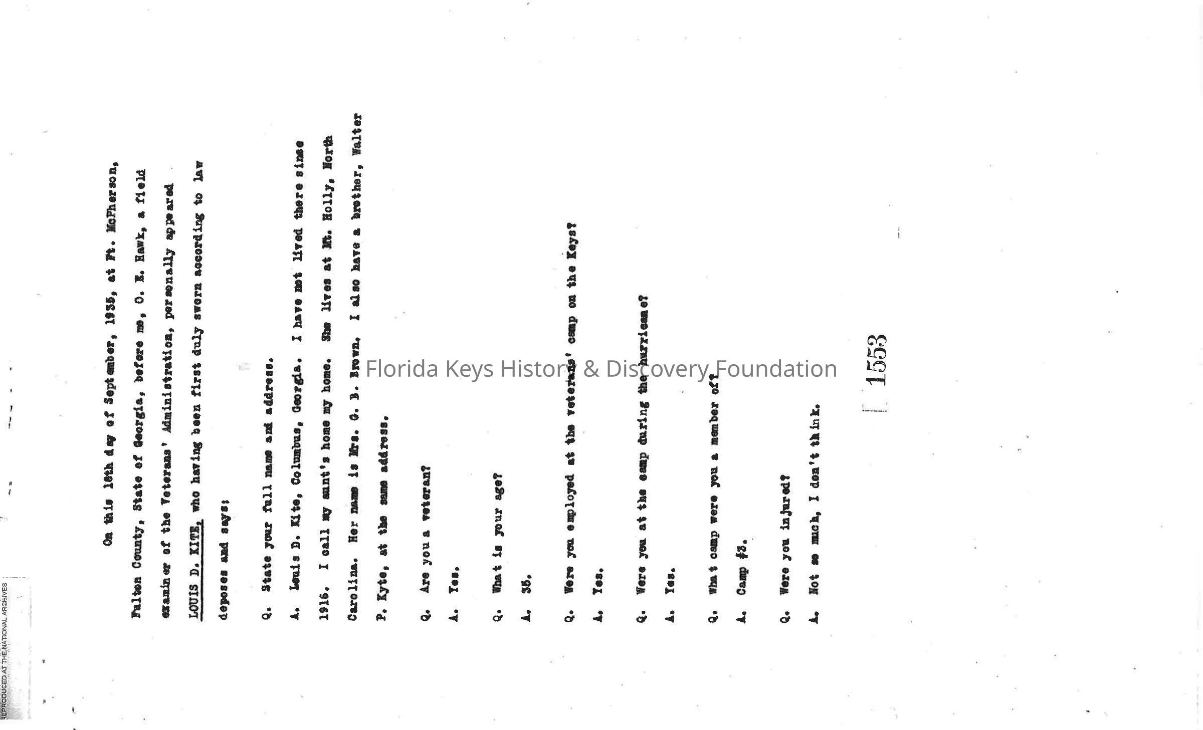Sept. 18, 1935, "On this 18th day of September, 1935, at Ft. McPherson, Fulton County, State of Georgia, before me, O. E. Hawk, a field examiner of the Veterans' Administration, personally appeared Louis D. Kite, who having been first duly sworn according to law deposes and says..."Creator