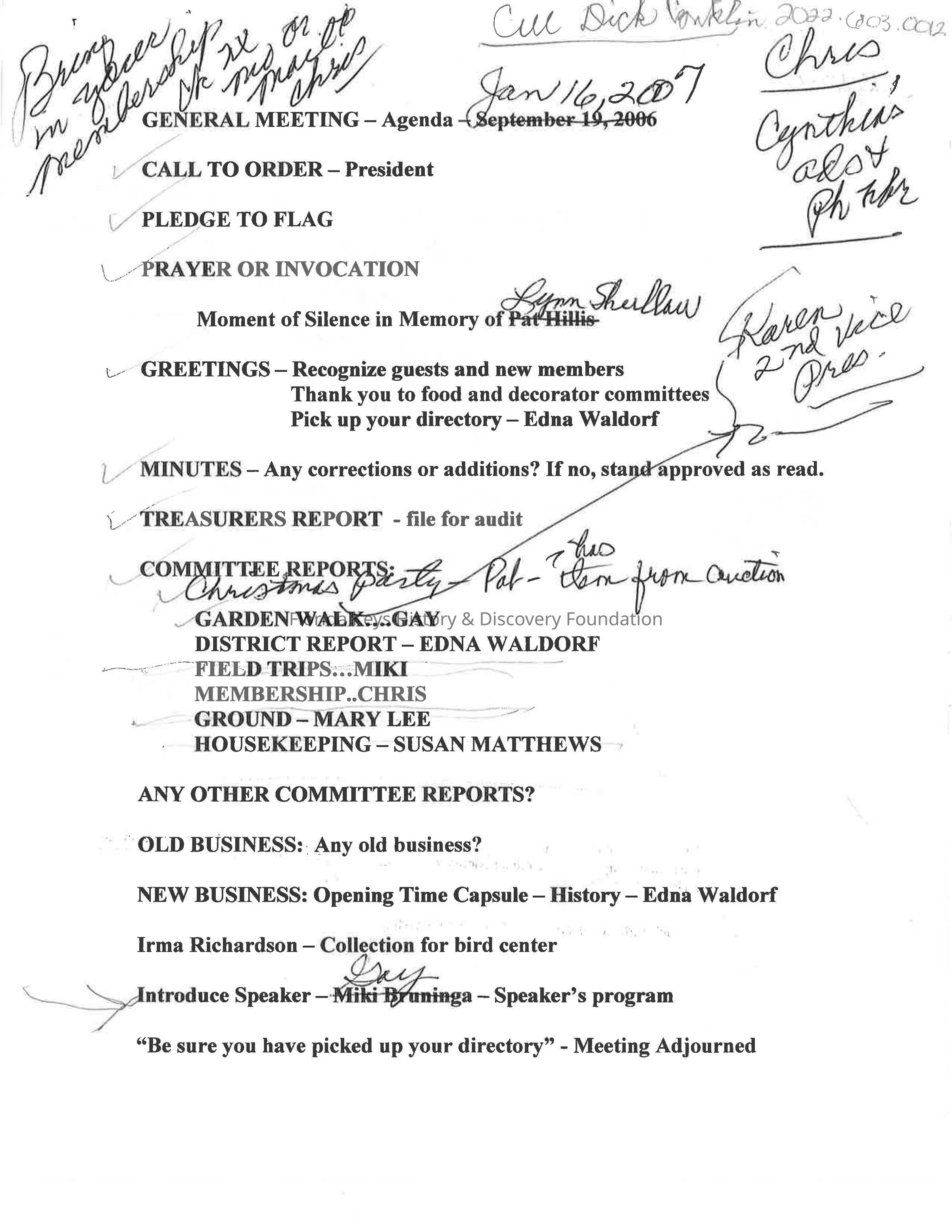 General Meeting Agenda, January 16, 2007Entry/Object ID