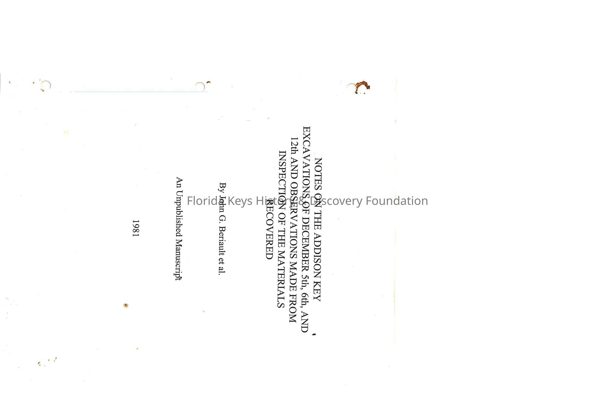 Notes on the Addison Key Excavations of Dec 5th, 6th, and 12th and Observations Made from Inspection of the Materials RecoveredEntry/Object ID