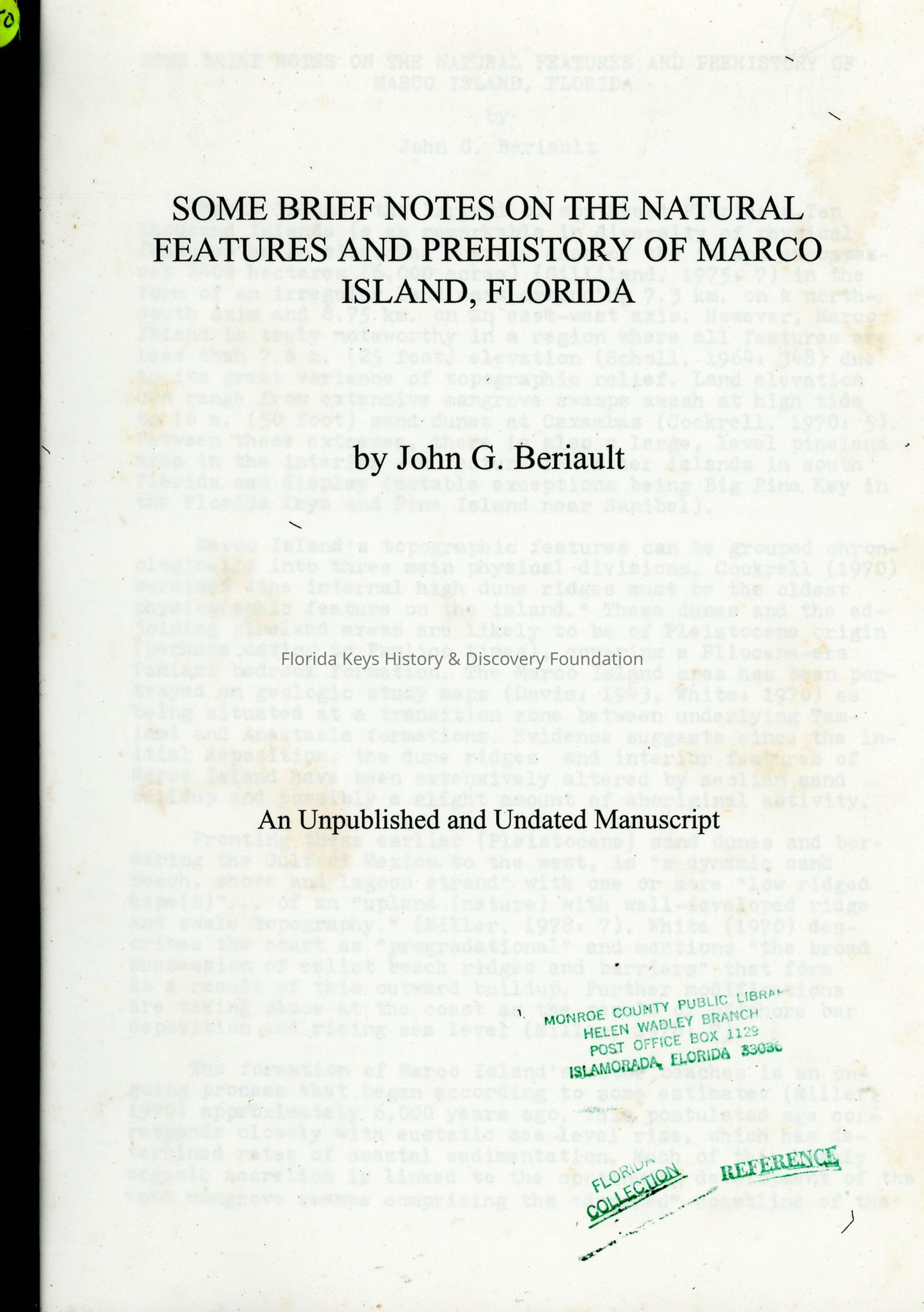 Some Brief Notes on the Natural Features and Prehistory of Marco Island, FloridaEntry/Object ID
