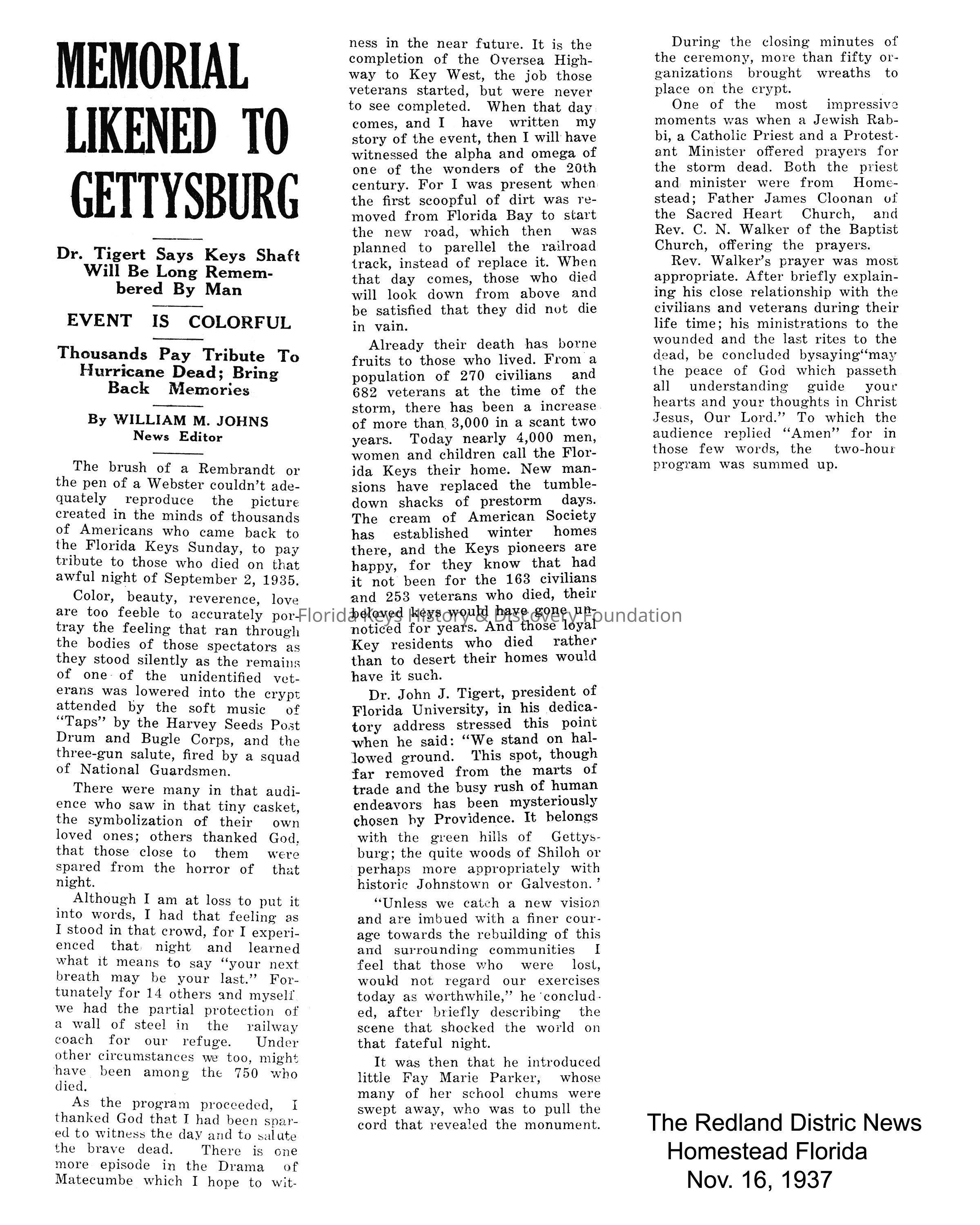 article from "The Redland District News" Homestead, Fl Nov. 16, 1937