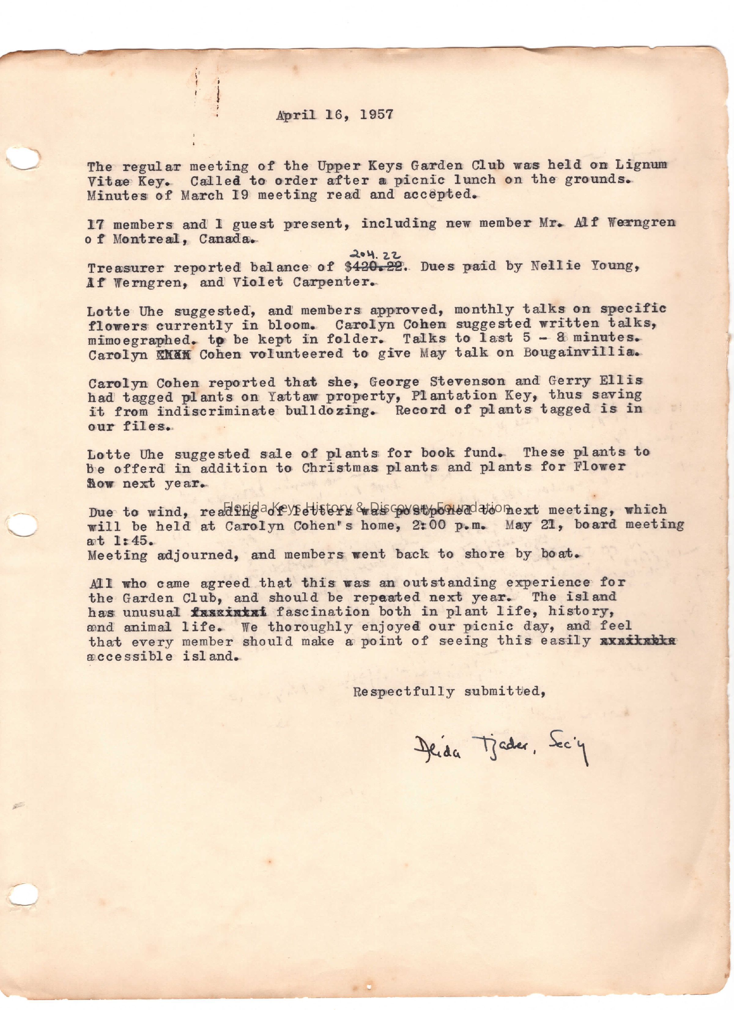 Minutes from club meeting held on April 16th, 1957 on Lignum Vitae Key.Collection
