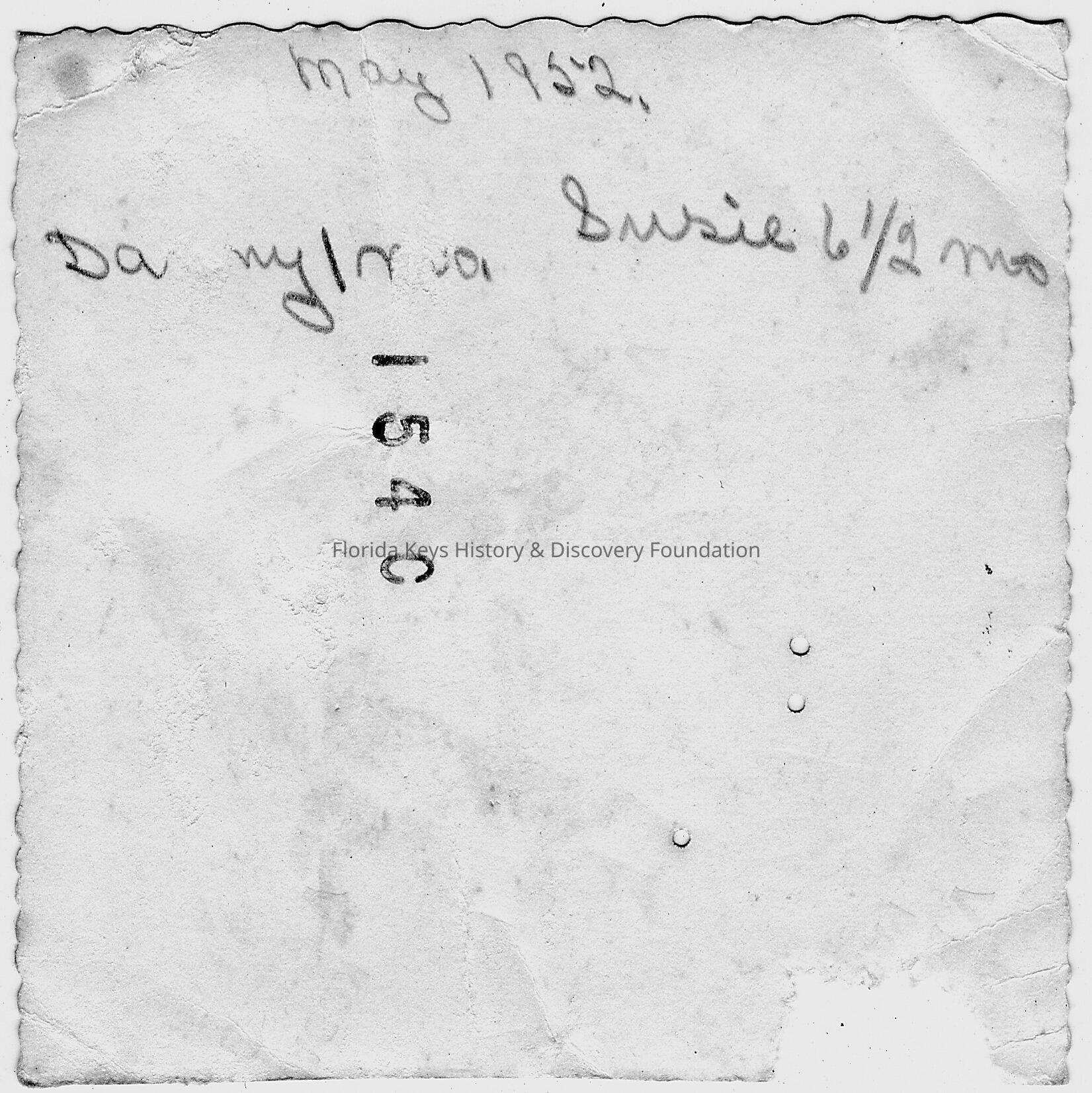 back of photo with caption "May 1952, Da___1 m___, Susie 6 1/2 mo"Collection