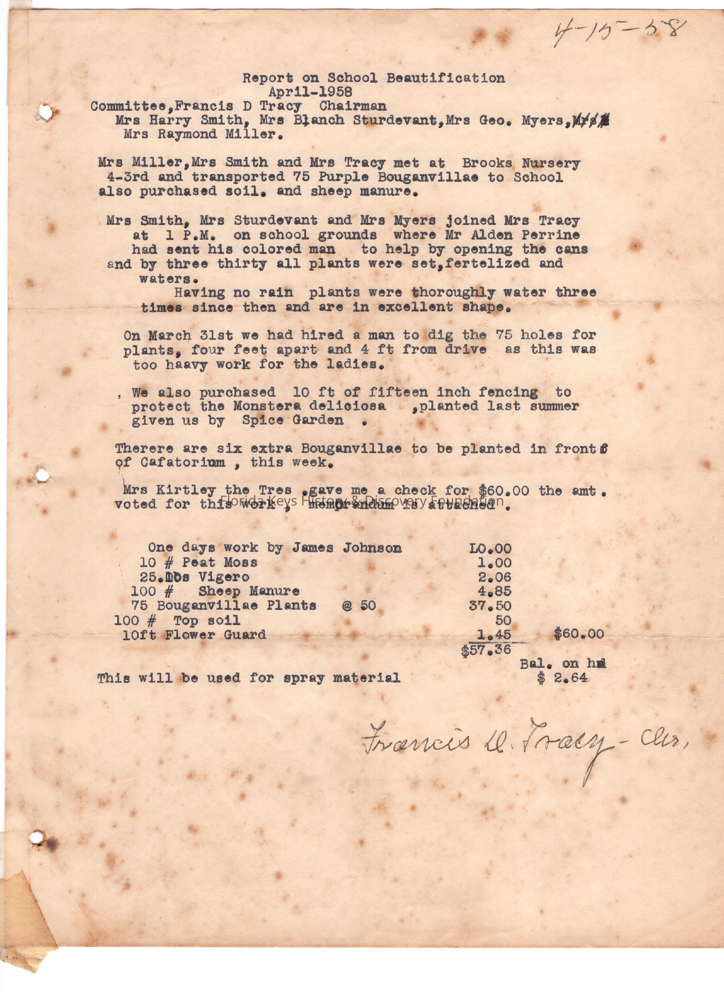 Report from April 1958 on Coral Shores school beautification project. Report to club on planting progress from Sept. 1858. Letter from Dr. R. Bruce Ledin to Alida Tjader of the garden club about planting fruit trees at Coral Shores School from August 28th, 1958. The two reports and letter were taped together.Collection