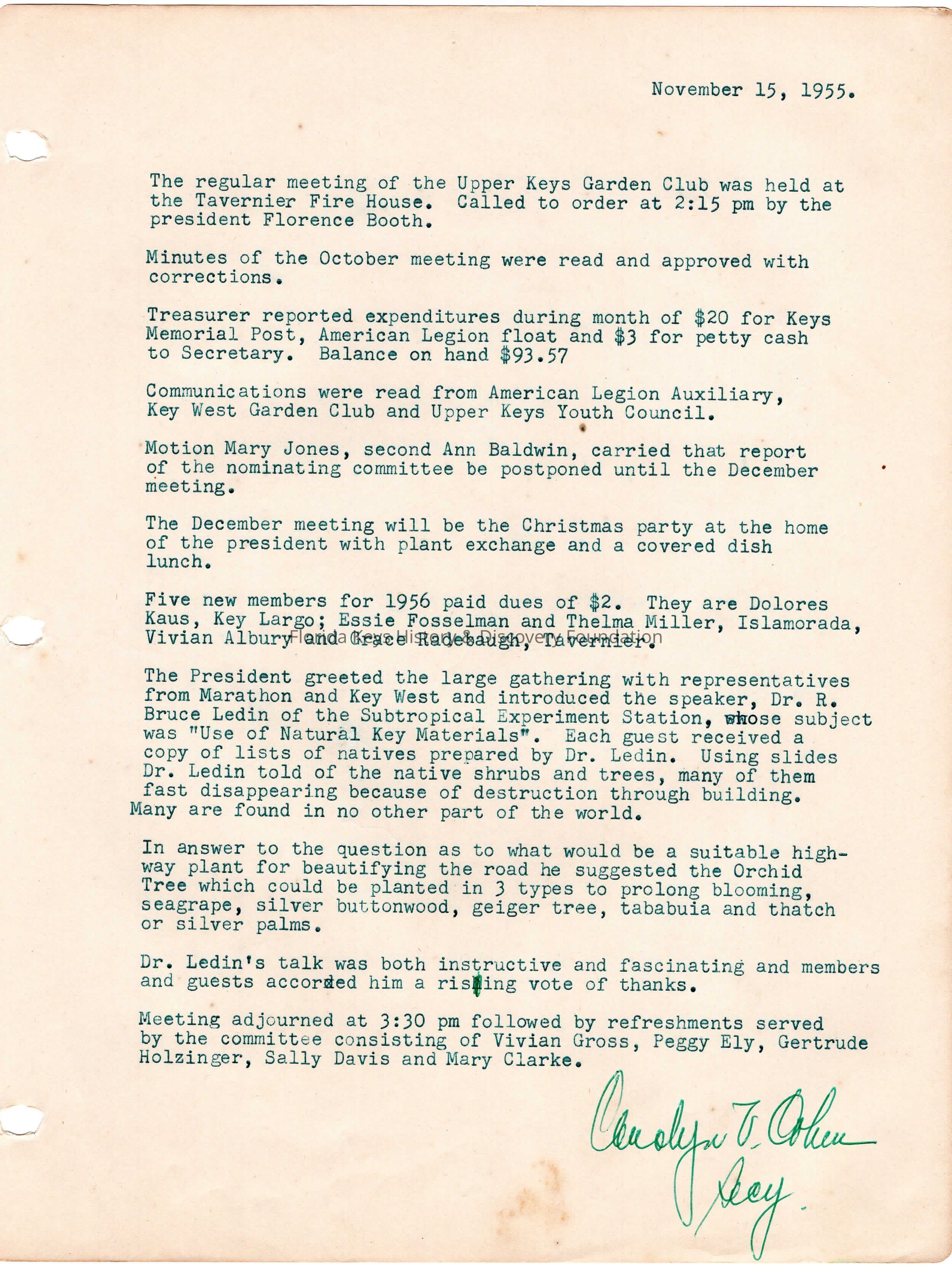 Minutes from meeting held on November 15th, 1955 at the Tavernier Fire House.Collection