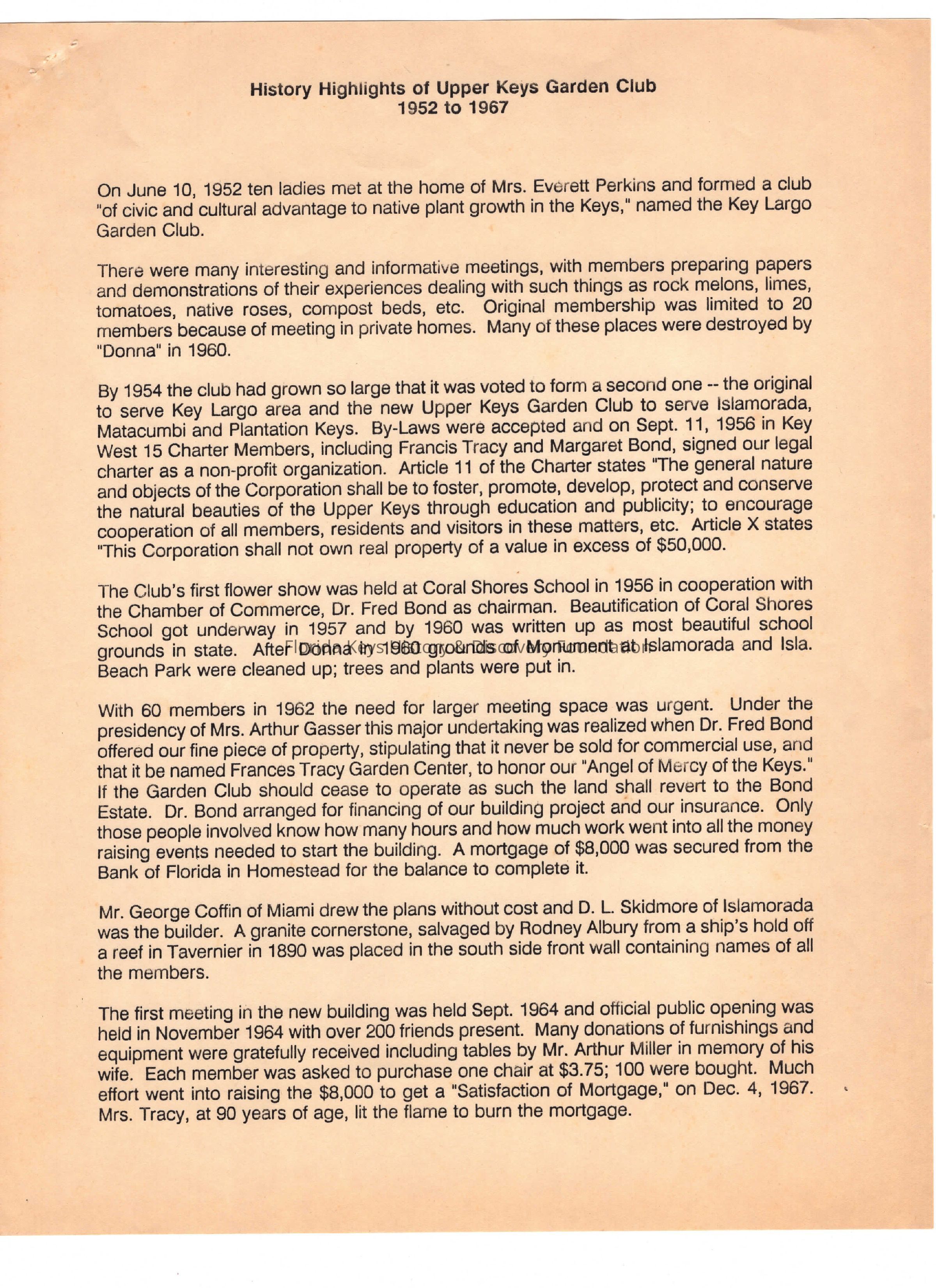 Typed history highlights of the Upper Keys Garden Club from 1952 to 1967.Collection
