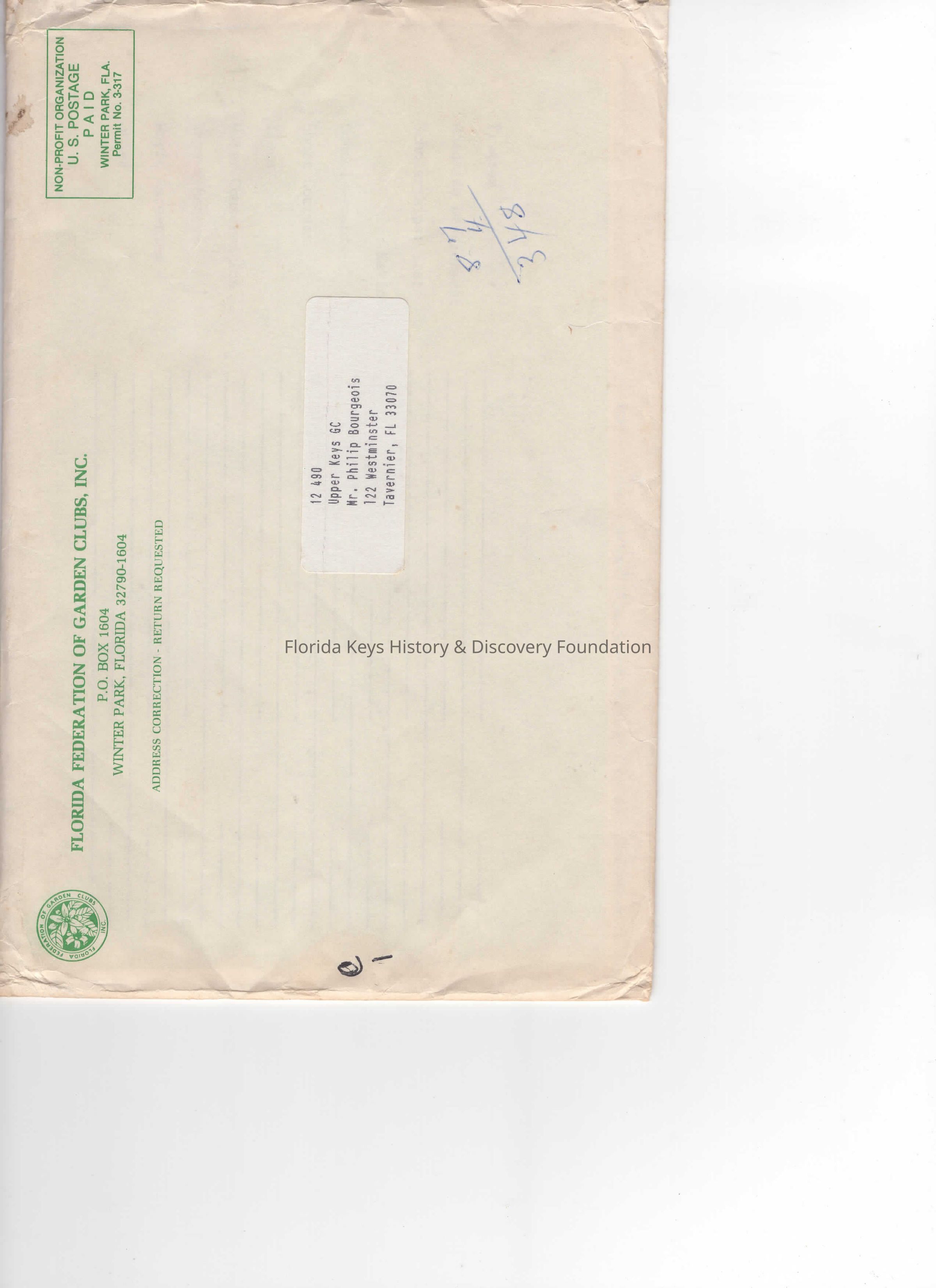 This envelope encases a calendar of events and information from the Florida Federation of Garden Clubs as well as from the Garden Club of the Upper KeysCollection