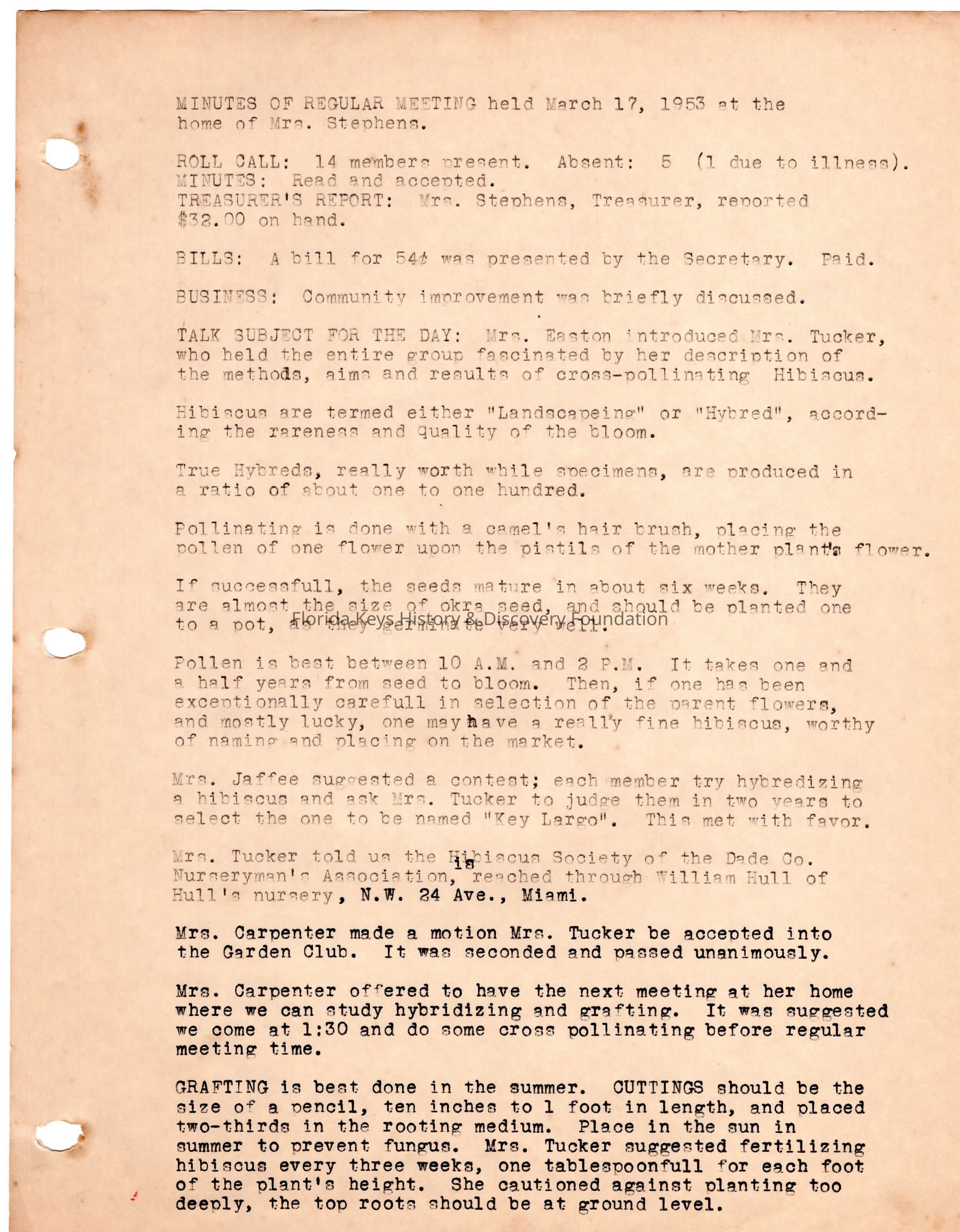 Minutes from meeting held March 17th, 1953 at the home of Mrs. Stephens.Collection