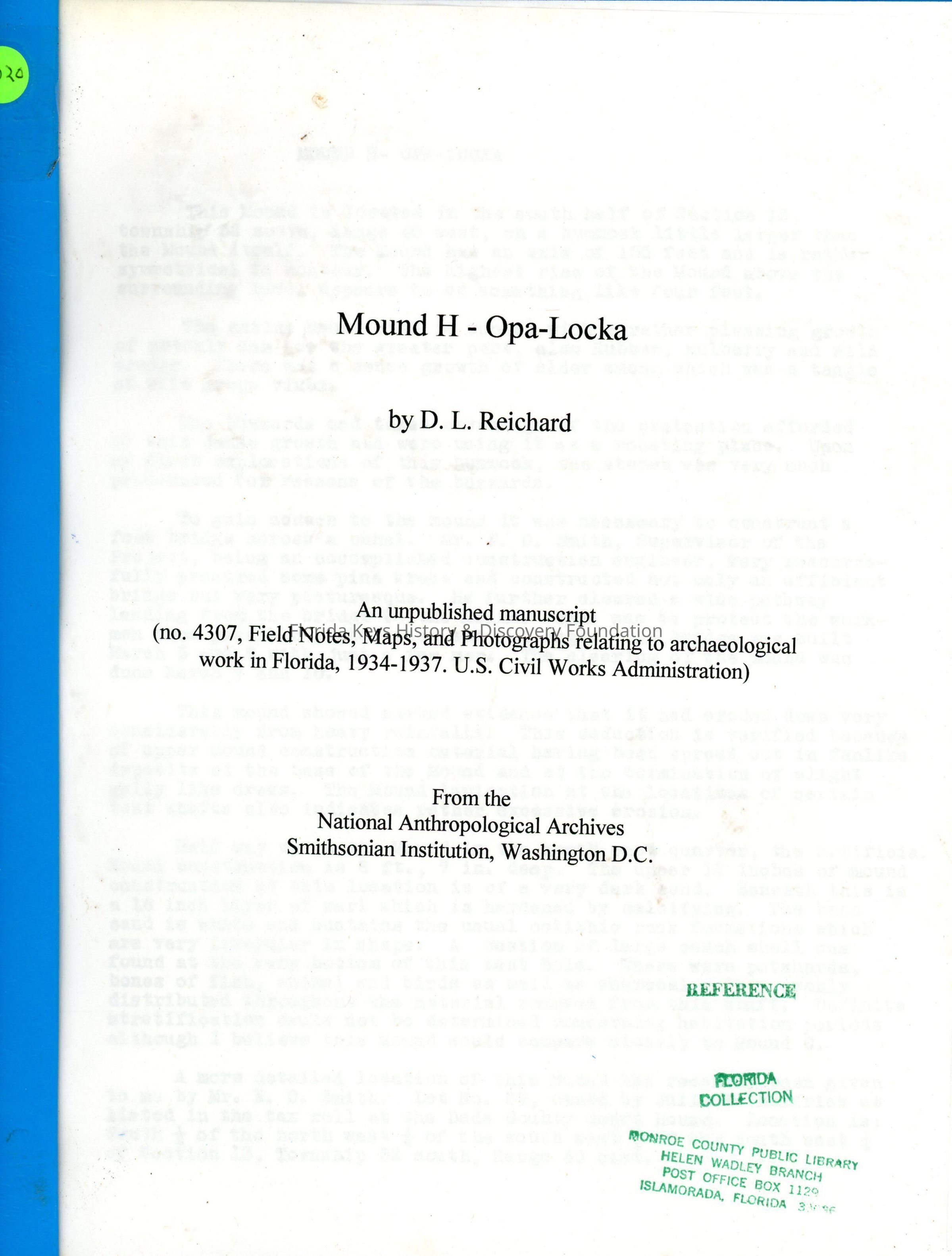 "An Unpublished Manuscript (no.4307, Field Notes, Maps, and Photographs relating to archaeological work in Florida, 1934-1937. U.S. Civil Works Administration)Context
