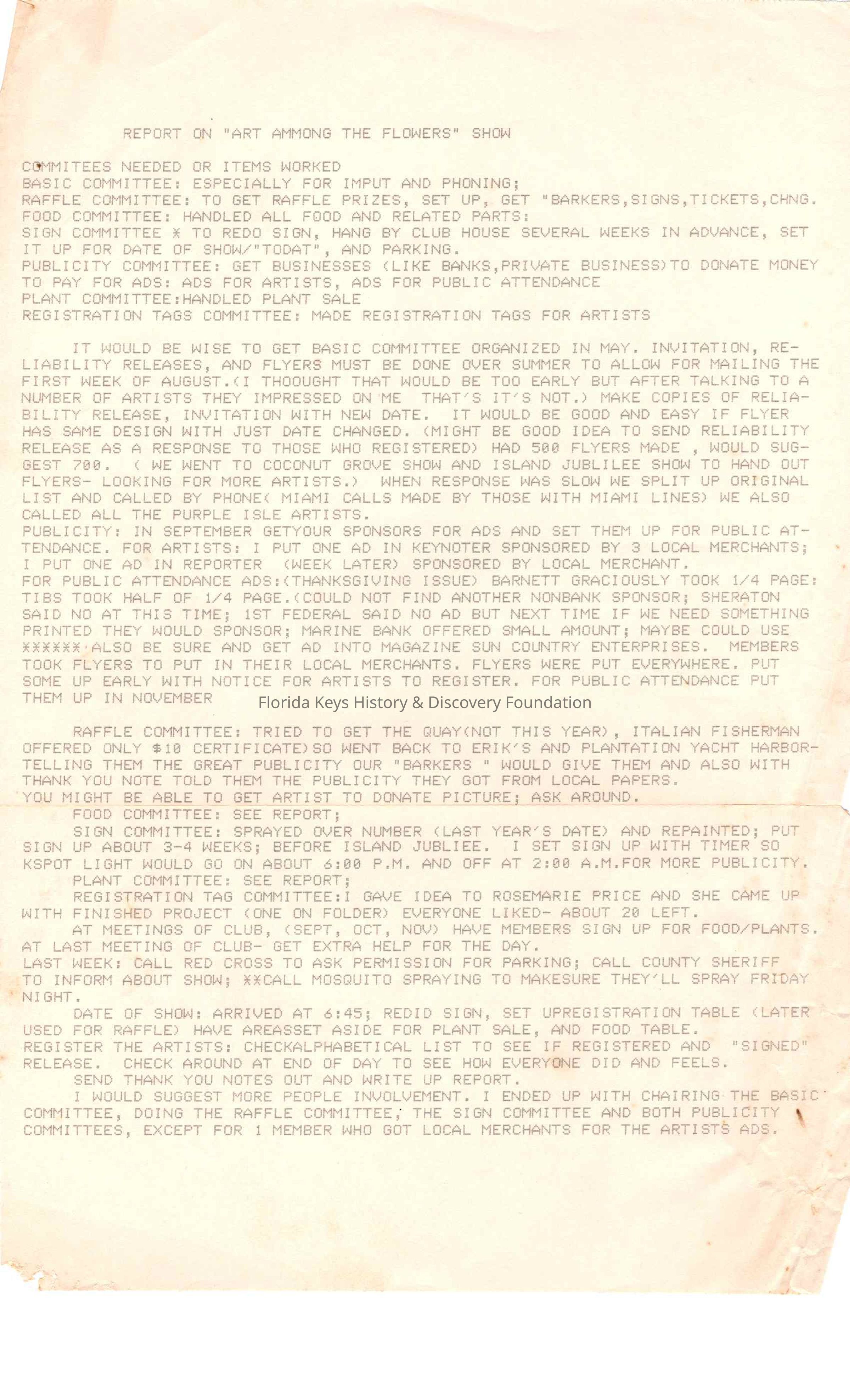 This is the report back on the Art Among Flowers show from November 1984. It is a compilation of all of the committee reports.Collection