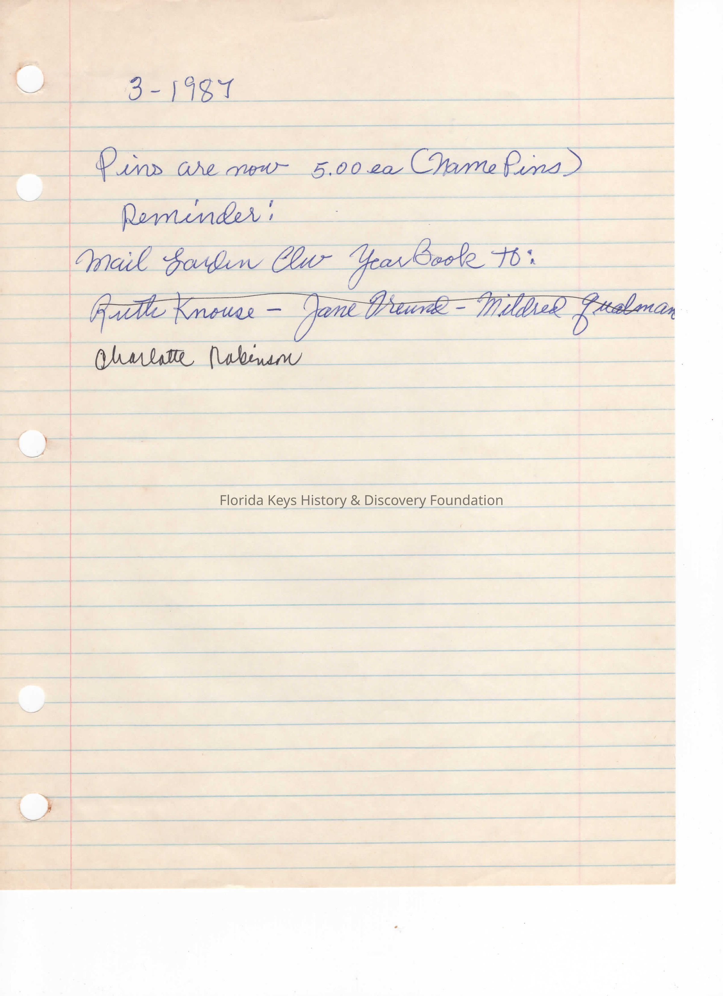 this is a handwritten note about the cost of name pins and information on yearbooks with namesCollection