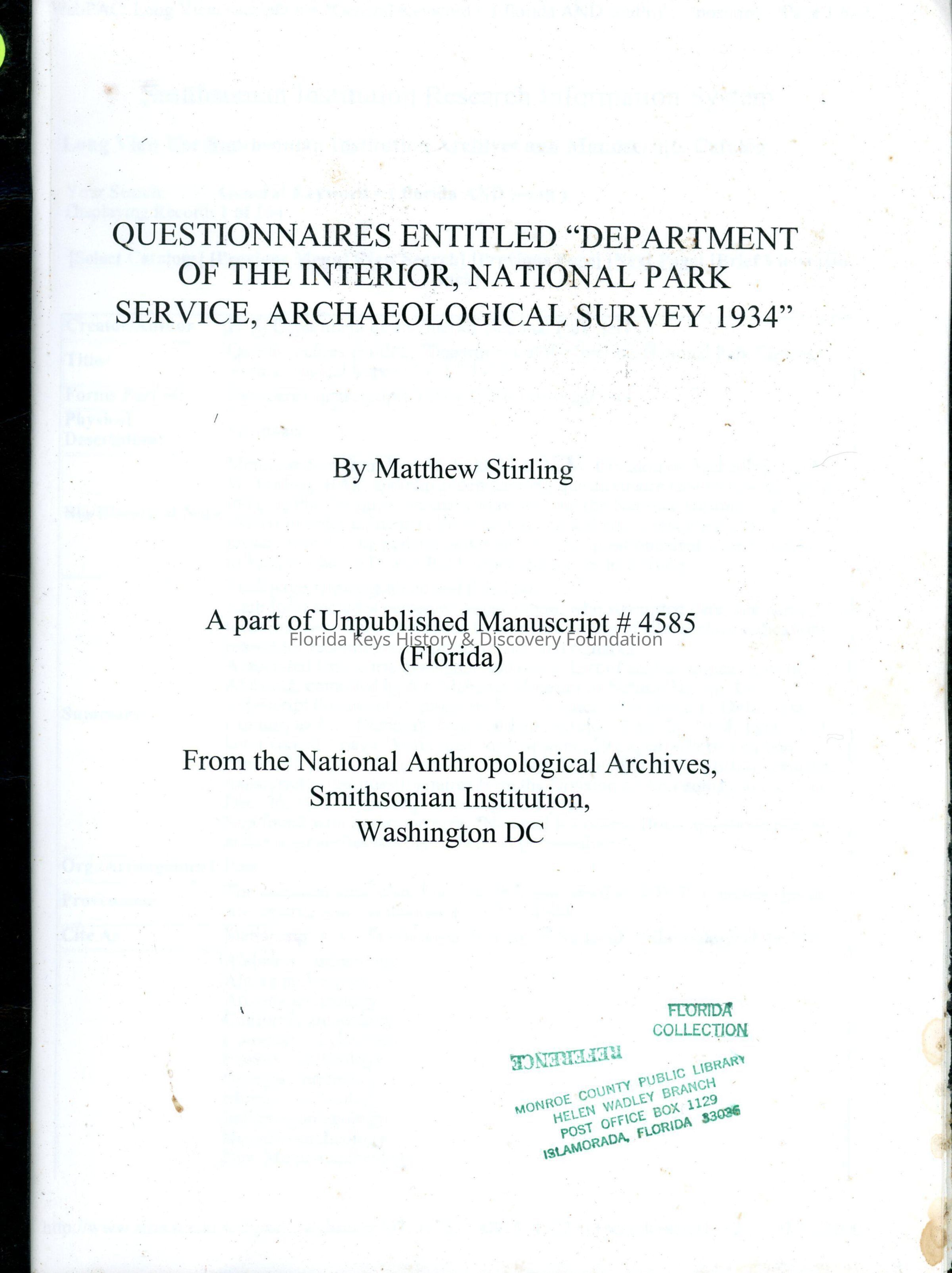 Questionnaires Entitled "Department of the Interior, National Park Service, Archaeological Survey 1934"Entry/Object ID