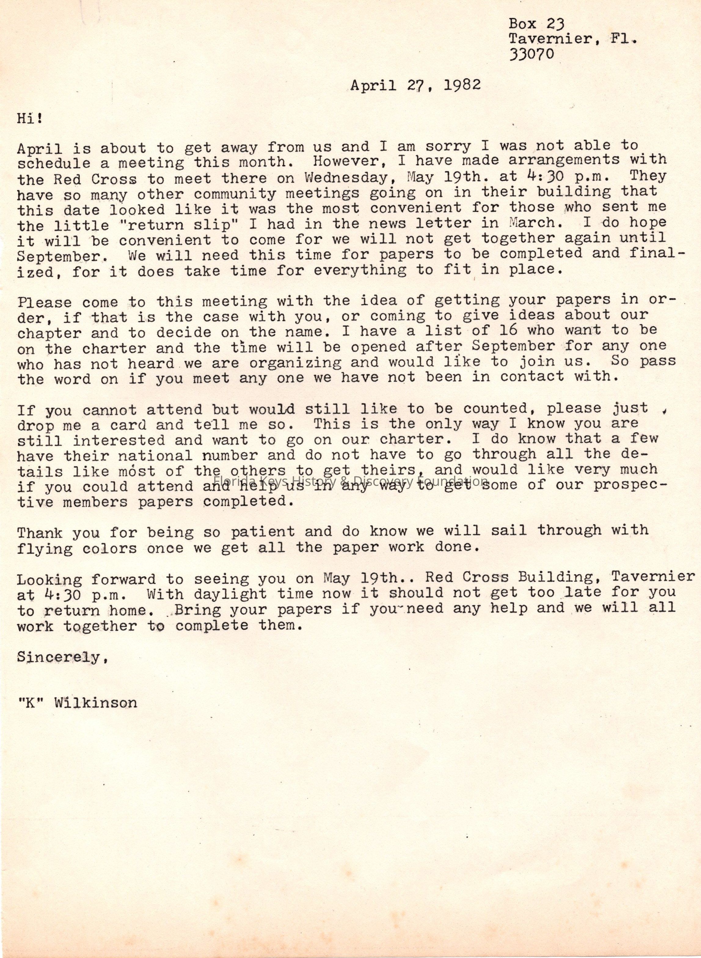Cancellation of April meeting, rescheduled for May 19, 1982 at Red Cross BuildingCollection