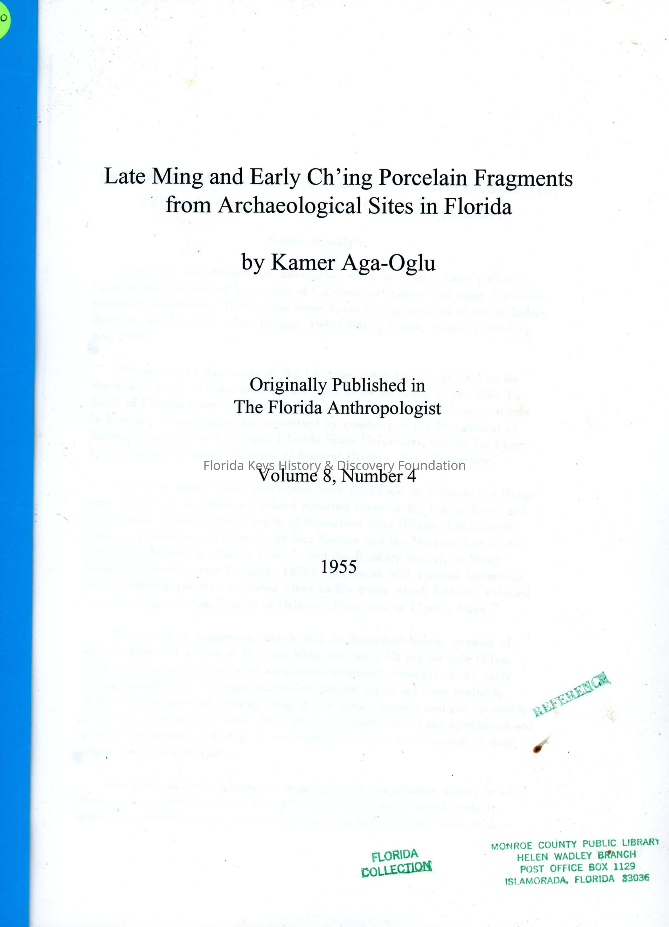 Late Ming and Early Ch'ing Porcelain Fragments from Archaeological Sites in FloridaEntry/Object ID