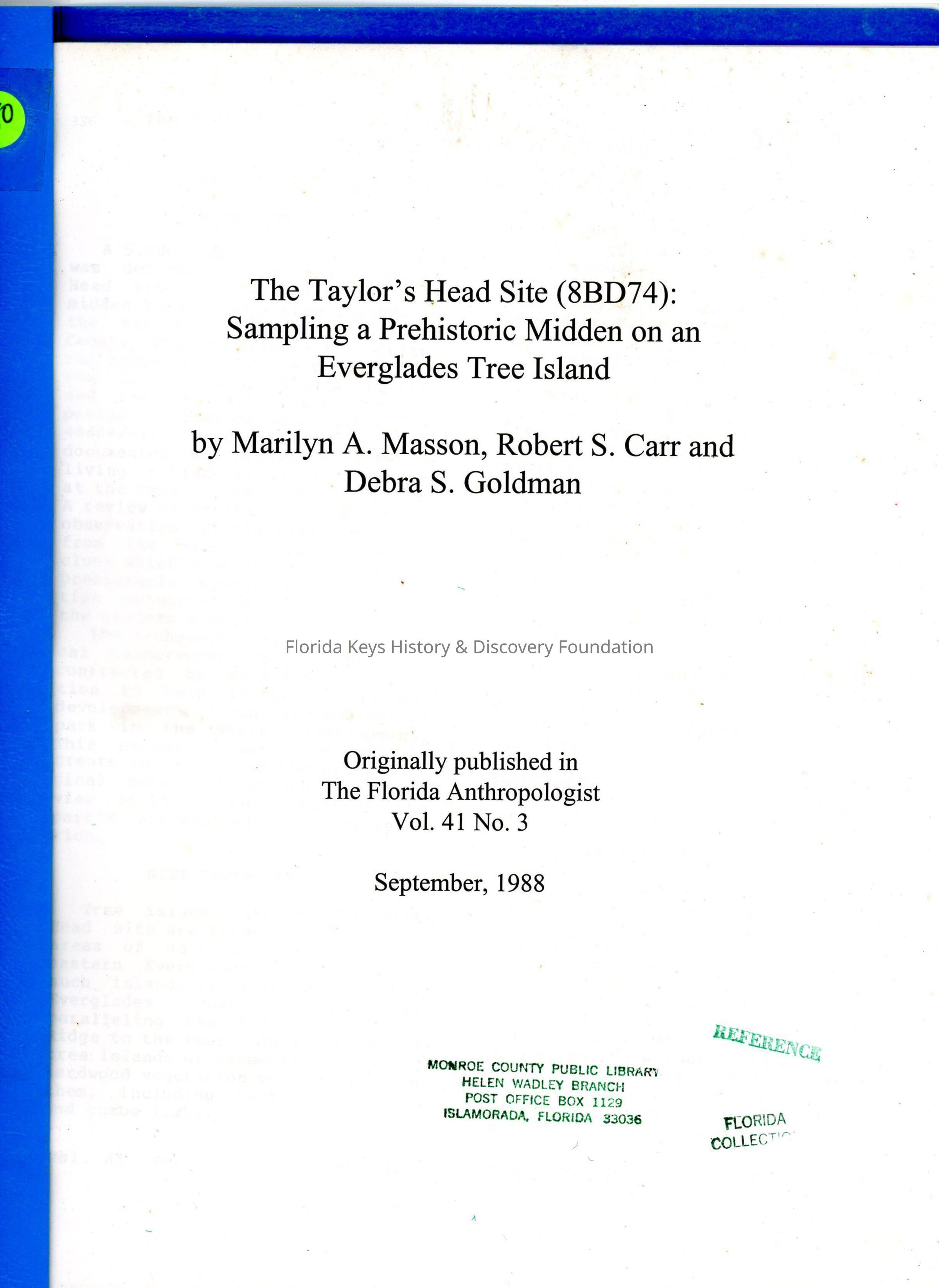 The Taylor's Head Site (8BD74): Sampling a Prehistoric Midden on an Everglades Tree IslandEntry/Object ID