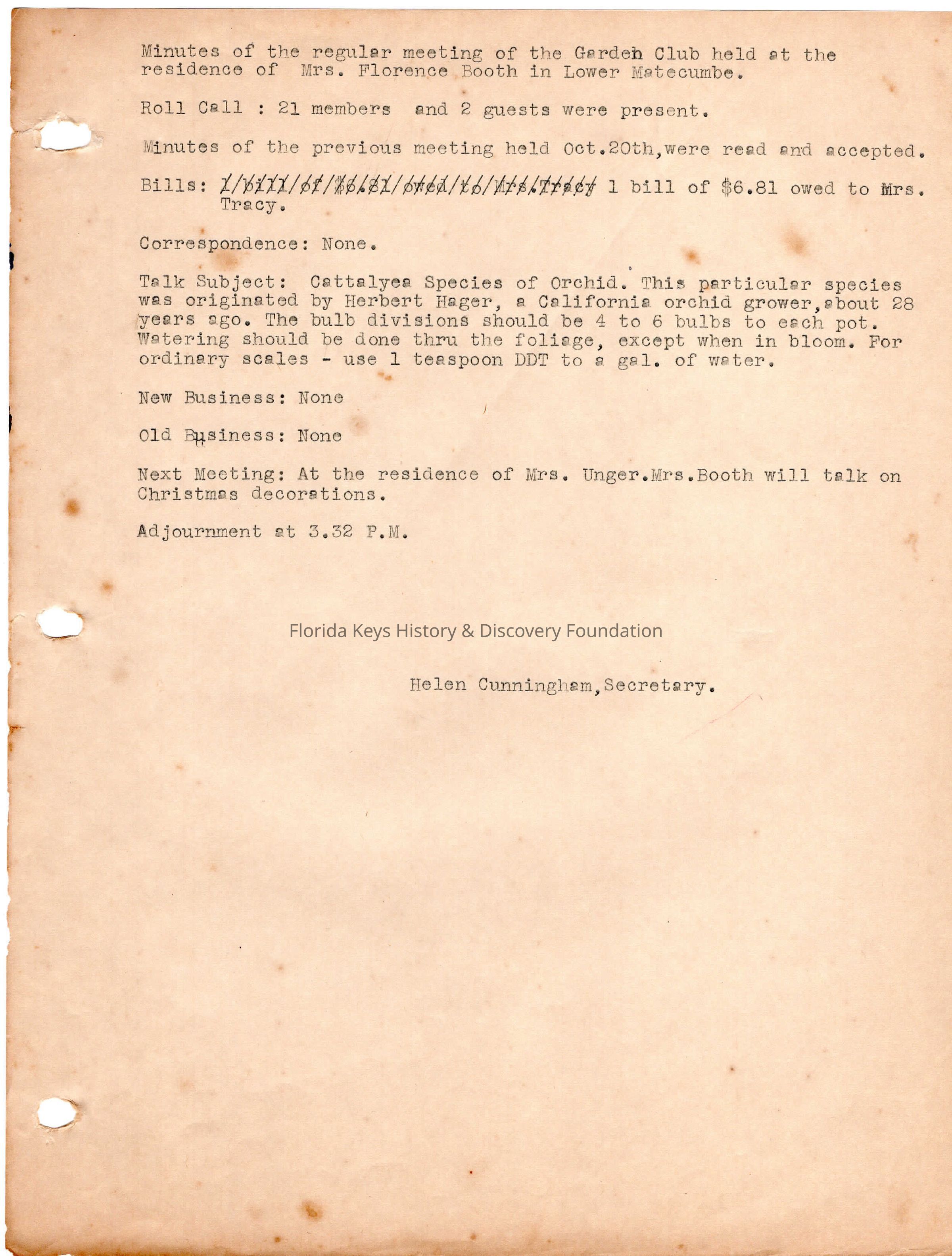 Minutes from meeting in November, 1953 at the home of Mrs. Florence Booth in Lower Matecumbe.Collection