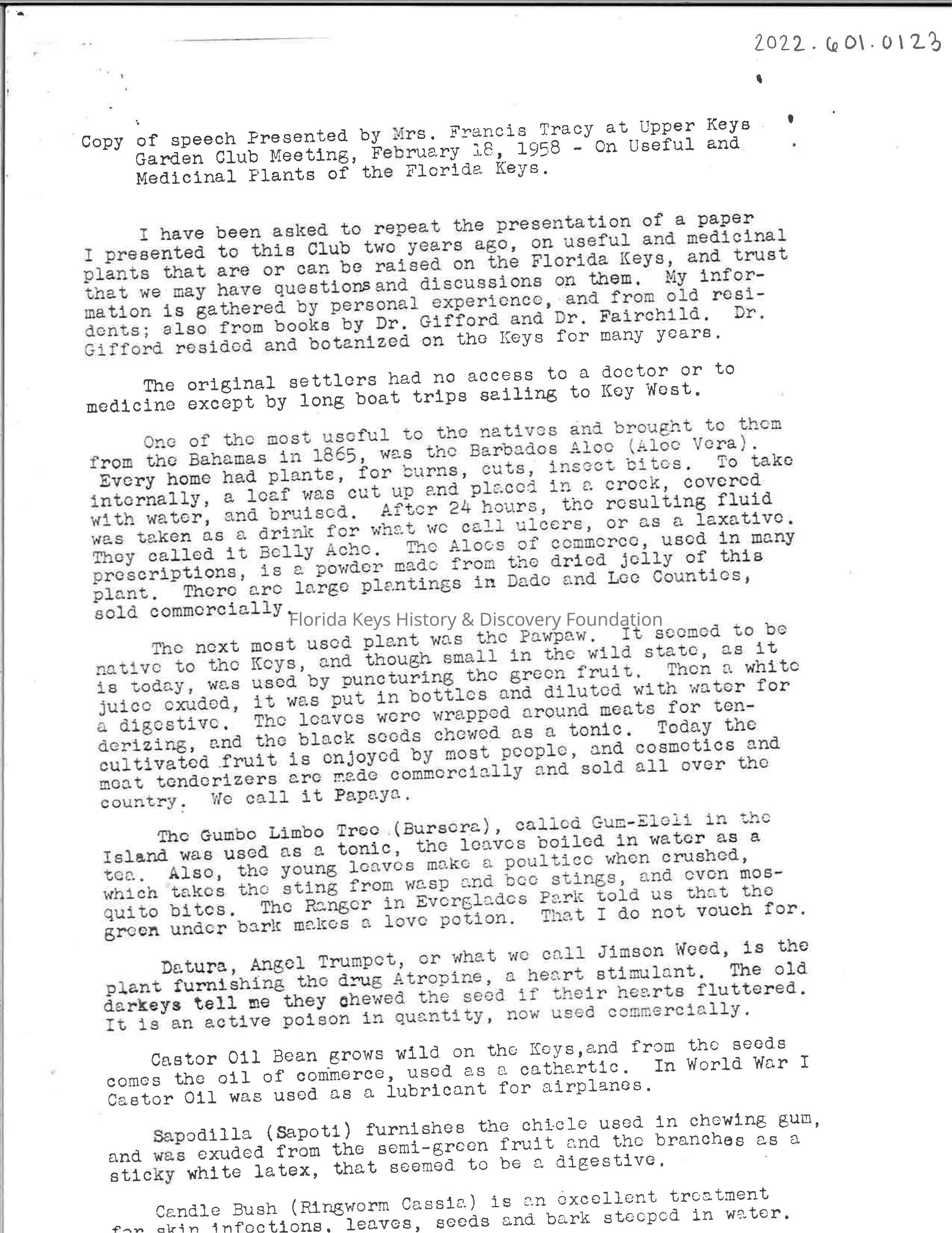 Copy of 1958 presentation given by Francis Tracy on Medicinal Plants in the F]lorida Keys.Collection