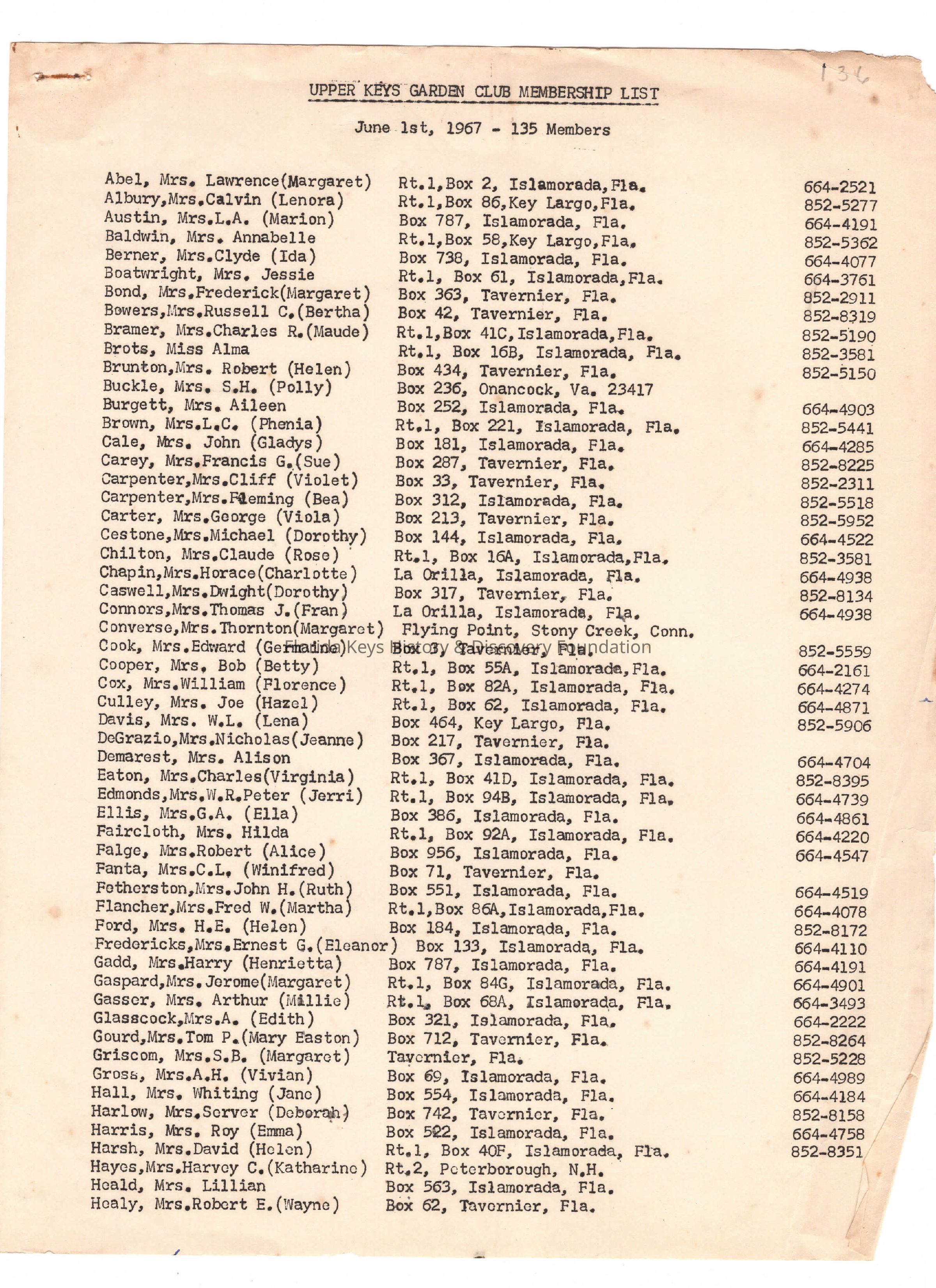 1960s, 1967, GCUK, Upper Keys Garden Club, Member List, MembershipScope and Content