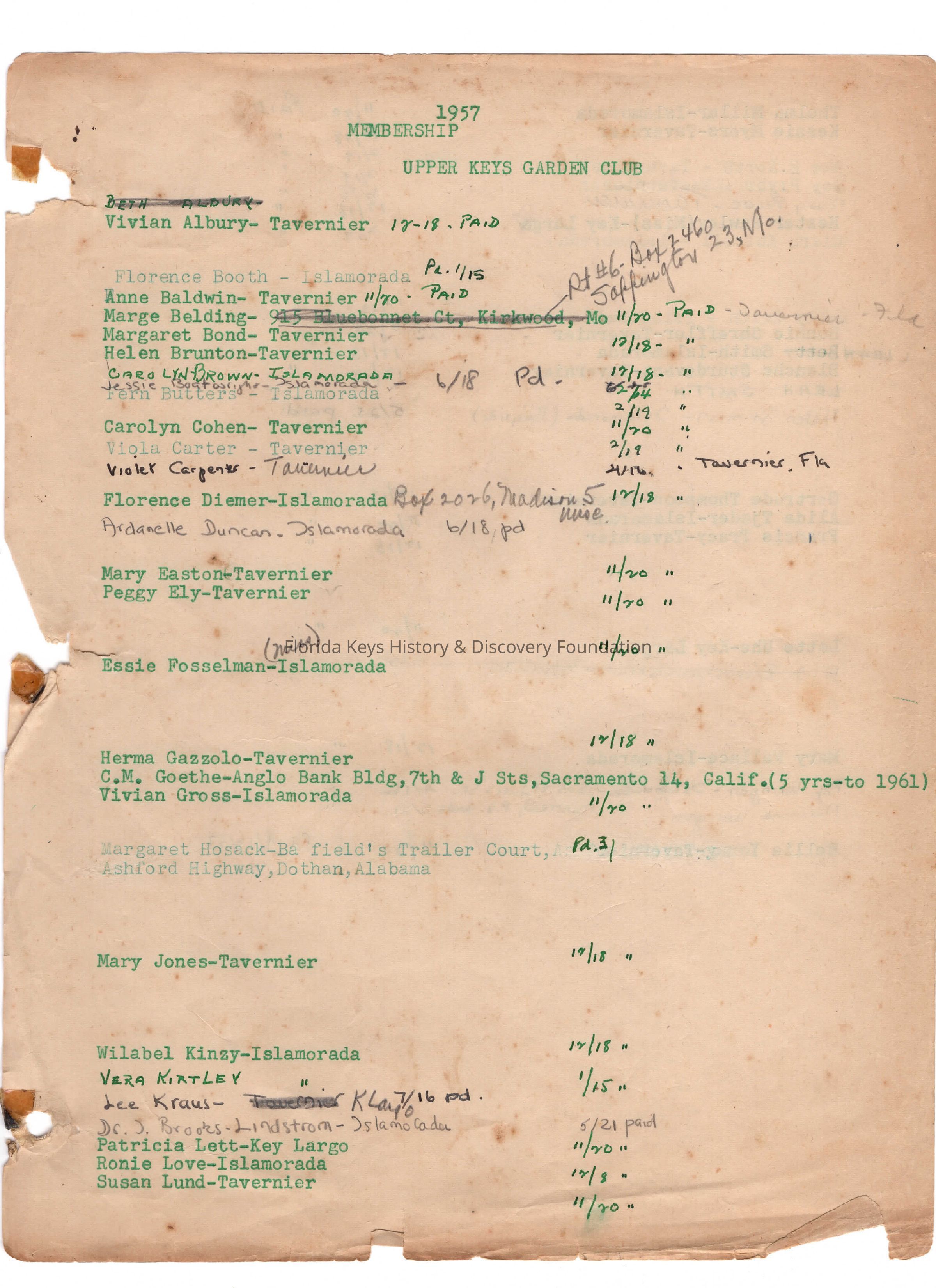 1957 Upper Keys Garden Club Membership ListEntry/Object ID