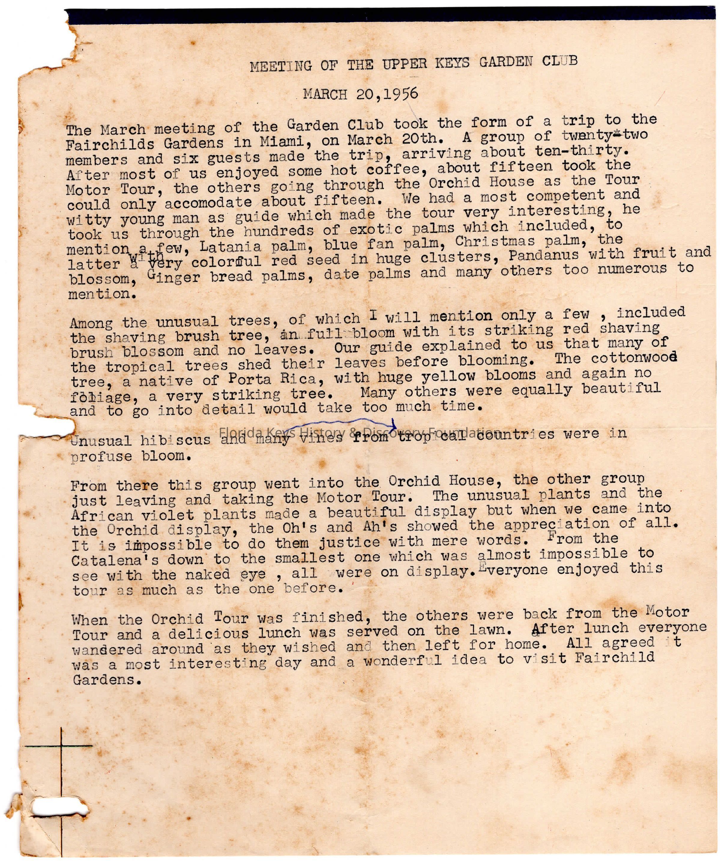 Minutes from club meeting held on March 20th, 1956 at the Fairchilds Gardens in MiamiCollection